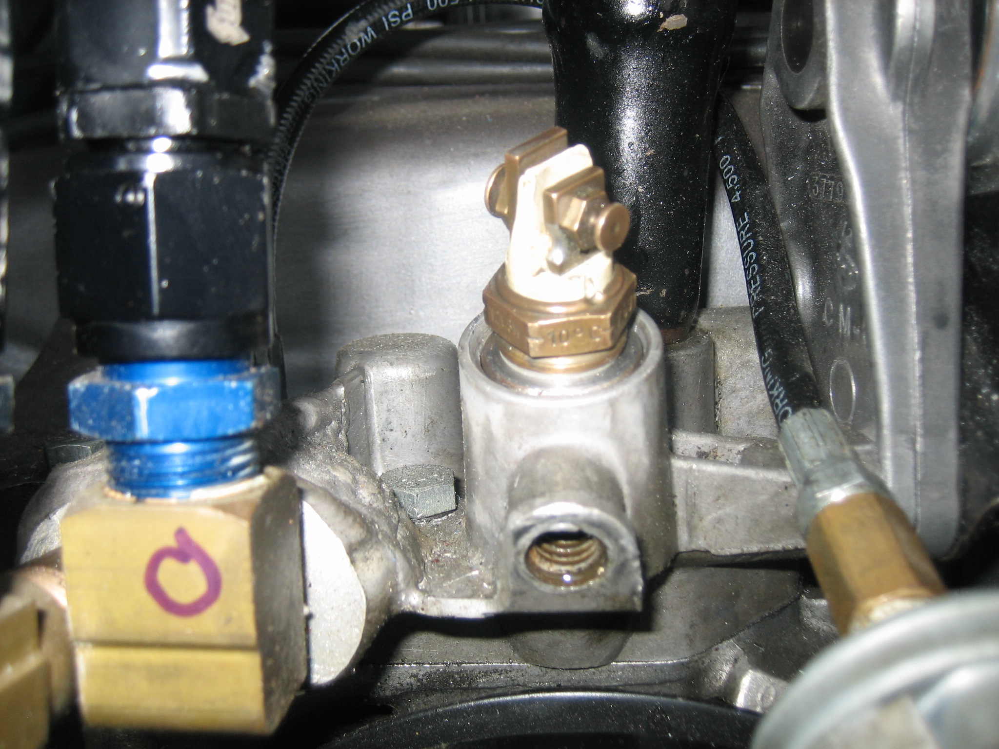 Taking a break due to another rain storm to post some success. I noticed earlier that the 5/16 NPT tap was very close to the 14x1.75 at its base. So, I gave it a shot I only need about 5mm of thread so this works out perfectly. The plug that goes into the hole where the mechanical fuel pump used to go was removed, placed in my lathe, drilled and tapped with the NPT tap. The thermotime switch fit perfectly and the location is very close to where it would be on the stock 911 motor.