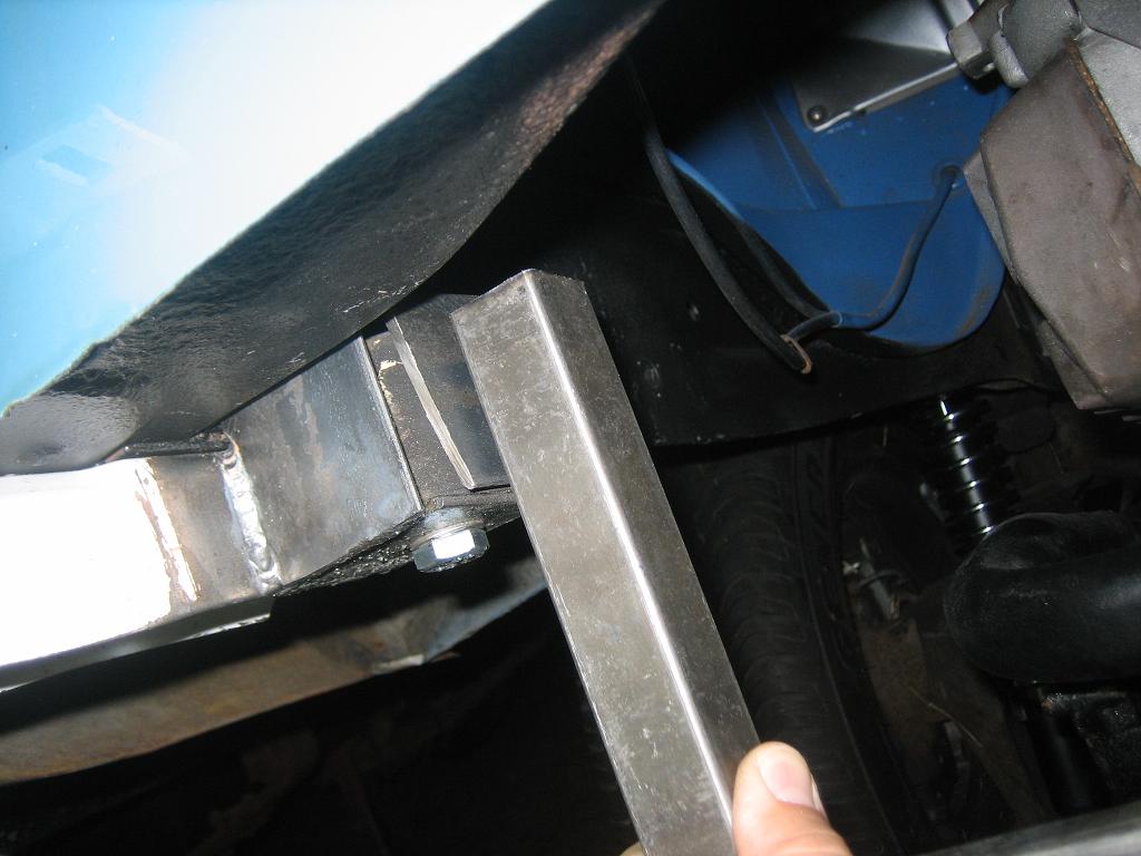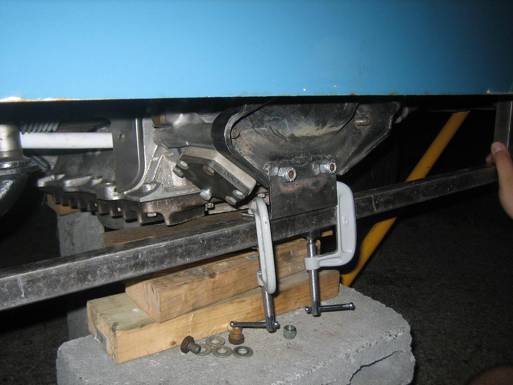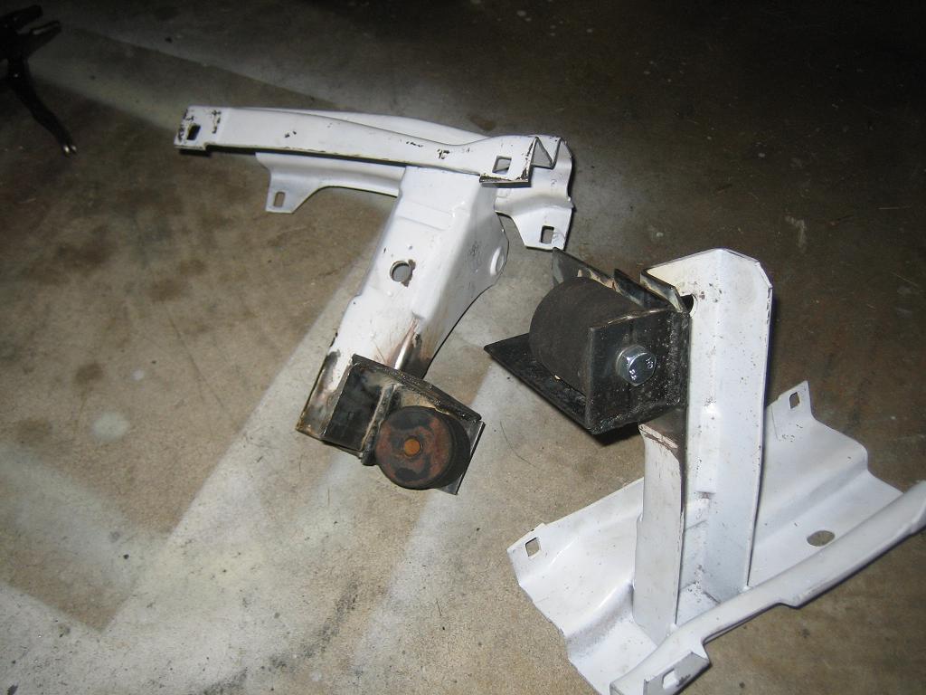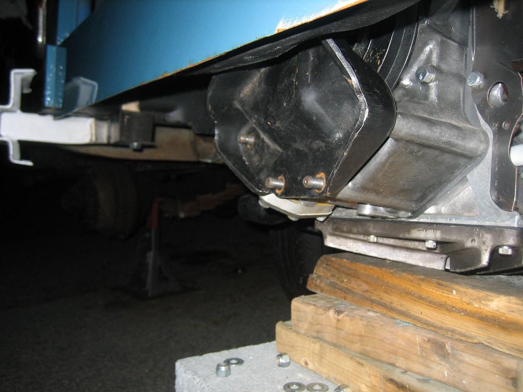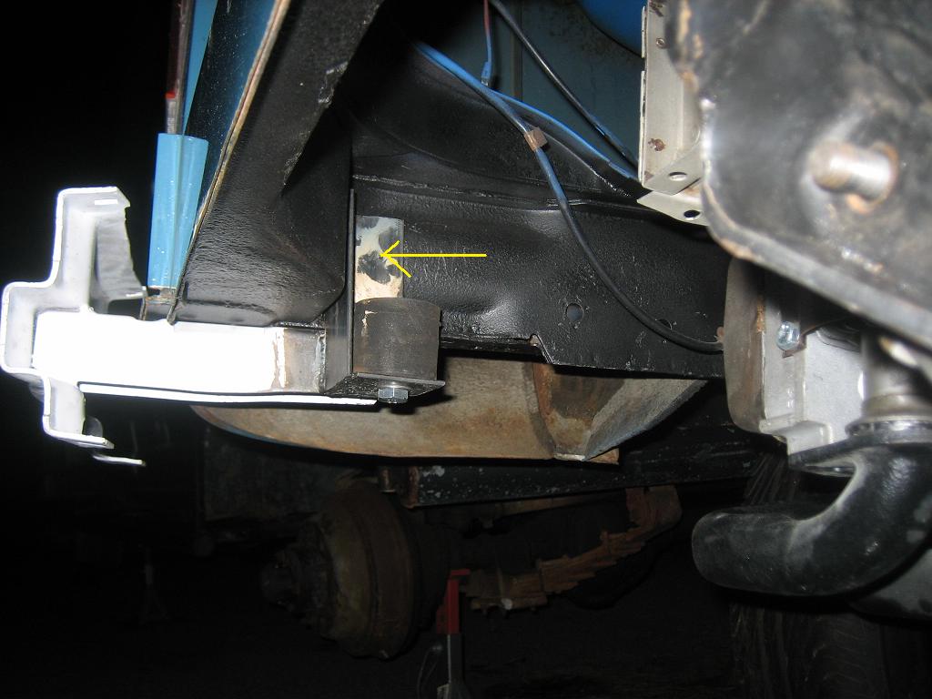 Here are the progress pics from tonight. The mount we devised utilizes the original tranny mount rubber pucks. The yellow arrow depicts where a 13mm bolt will be added to strengthen the mount to the frame. Attached thumbnail(s) |