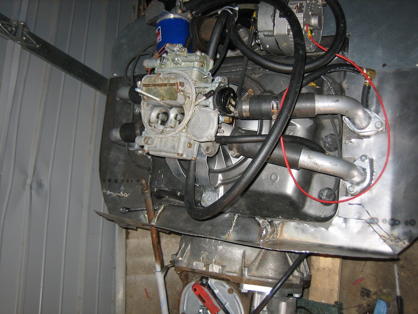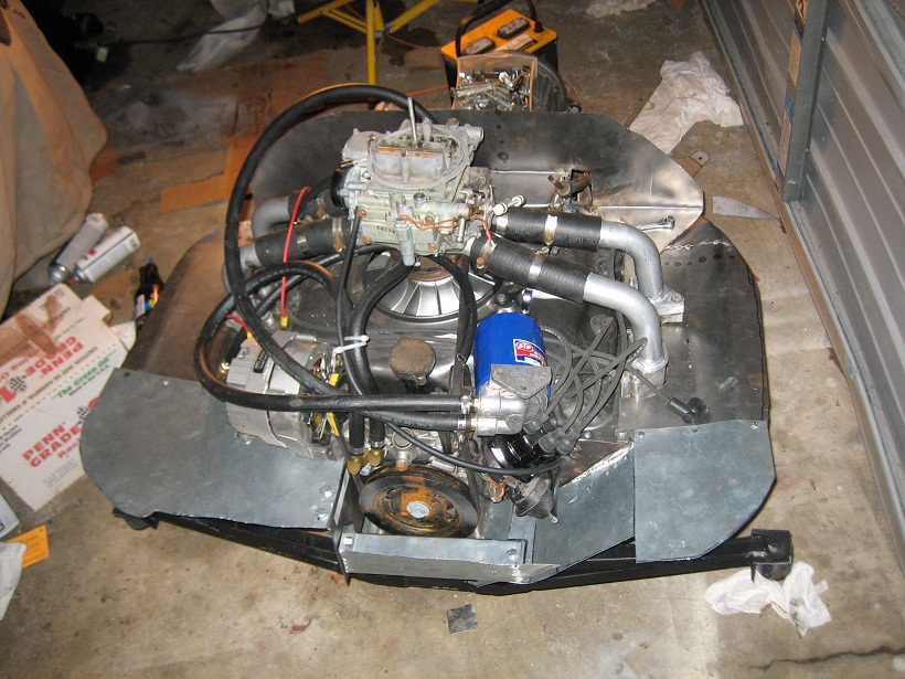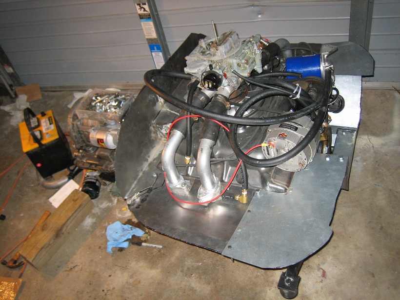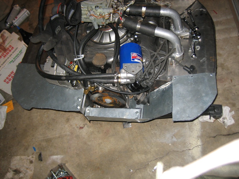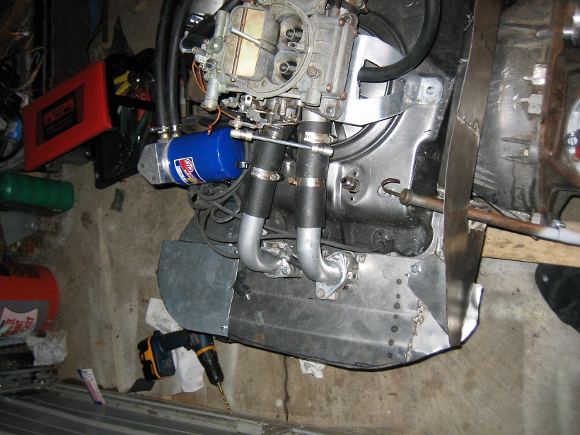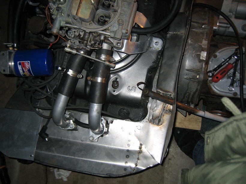 Zach is right, there was not much to take pics of. Welding the nuts to the sheet metal was fun, easy and will allow for it to be assembled and disassembled easily. Zach hooked up welding the adapter with the O2 sensor bung. Now I think I will get the headers coated. They are rusting pretty bad just sitting there. I had to adjust the throttle linkage since I lowered the carb. Also put a hole in the front tin to accommodate the linkage. I will be putting some rubber seals around the hole to reduce hot air flow into the engine bay. Then clean up and paint. After that, probably installing the engine.......when I can dig out the rear of the bus. (IMG:style_emoticons/default/dry.gif)