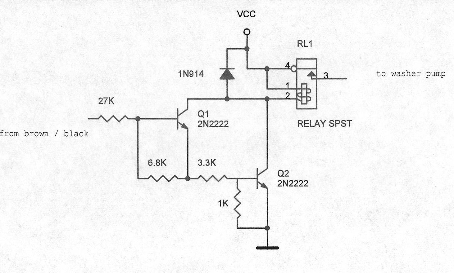 Mark, Do you have pictures of the circuit card? I'd love to have both working. Mike Here is a drawing. The card is installed in the car so no pictures of my work. The relay is a Radio Shack PC relay with a 5A contact. The input is the Brown / Black wire from the wiper switch. It is connected near where it goes to the intermittent relay. The washer pump is grounded on one side. The output of the relay provides 12 volts. I should note I forgot the suppression diode across the relay coil in the drawing. Place the cathode to the +12 volt side and the anode on the other side of the coil. |
