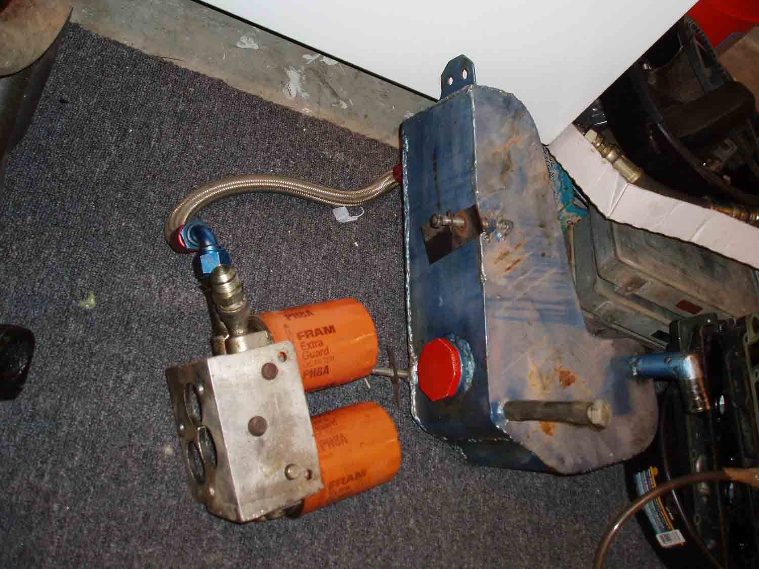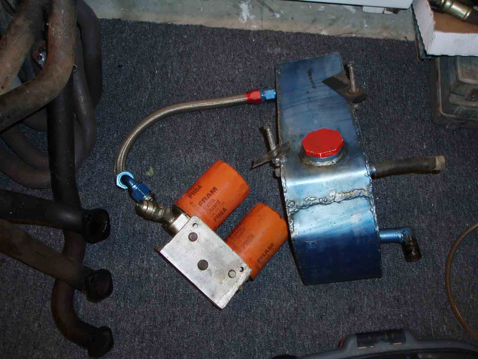 I was looking at this and wondering, why is it necessary to have the plumbing and oil filter hookup in/on the tank? If you are building your own, why not simplify it and place the filter vertically, and remotely? Make the tank a tank, oil in the top, out the bottom. No? It looks like the aluminum tank is built this way. A remote filter console is not a big deal. The filter should have the builtin check valve though I would think. |