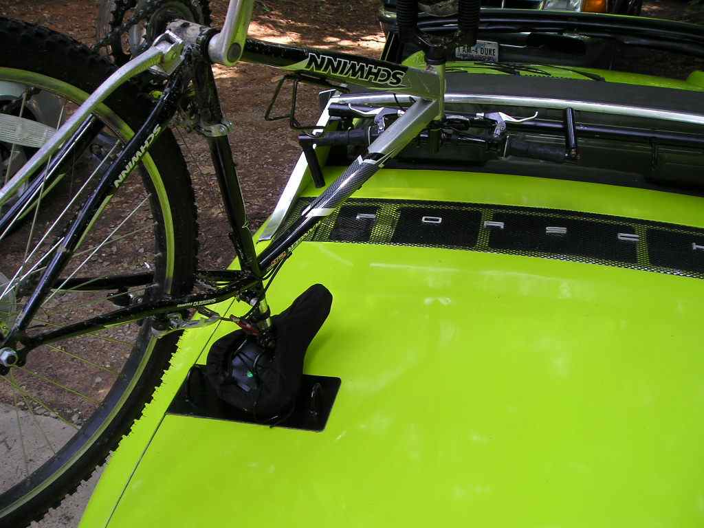 ![]() ![]() I used old Yakima parts i have had forever, and the engine lid has been reinforced under the fork mounts....will need to control the pedals to keep them from hitting the trunk lid, and may have to add a scratch preventor plate under the fork mounts after the car is painted! I think this is a good solution. I can add 2 wheel holders to take the front wheels, or put them in the trunks |