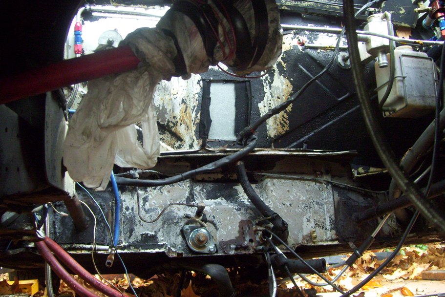 QUOTE You gonna cut the engine shroud/tray's out? Now is a great time for it... Are they held in with spot welds that can be drilled out? My engine will be coming out this winter for a TT swap also, and those shelves have got to go.Yup. Drilling spot welds for the side shelves and the rear seal strip. The front shelf must be trimmed manually since the shelf is actually part of the firewall stamping. Looks so nice with the shelves gone in conversion cars. (IMG:style_emoticons/default/drooley.gif) Attached image(s)