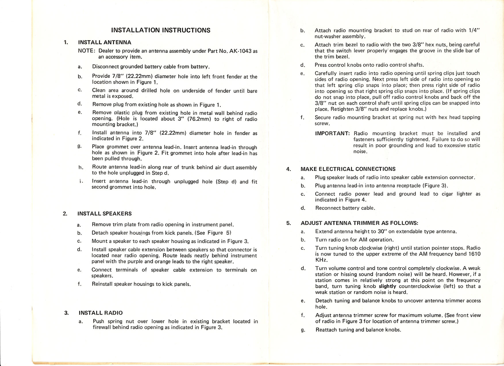 My set-up, which I think was dealer installed, got it's power from the cigarette lighter. The speakers were wired in parallel for mono operation. I've removed the entire system due to its marginal performance. You're welcome to it for a modest price. It'll have to be packed well if shipping is required. One of the speaker enclosures has a crack at the bottom. I'll include the antenna too. Let me know.