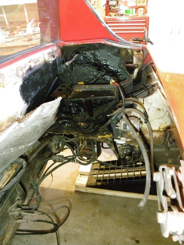 Heres a pic of the hole in the front trunk.. it also has holes under the headlight buckets.. I dont want to take off the front fenders so it will be a fun one for sure... Also, pictures of the hole in the firewall... yes thats spray foam... added in a few places under the tar... for sturctural rigidity I'm assuming.. (IMG:style_emoticons/default/WTF.gif) (IMG:style_emoticons/default/headbang.gif) battery tray has been replaced alread, but its gotta come out.. its actually solid in behind it...