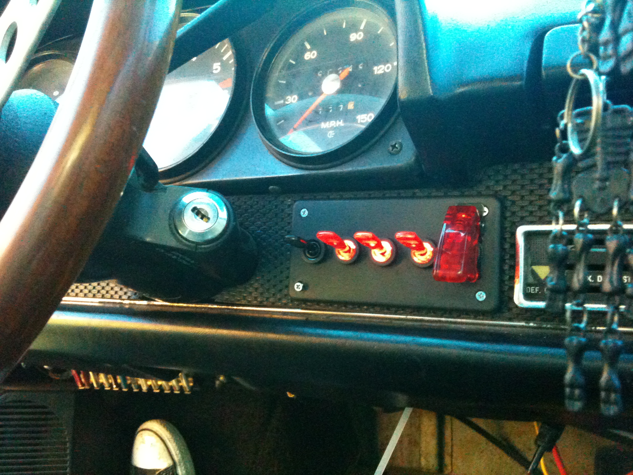 Howdy, first time caller, long time listener. I've got a '73 in yellow in the Austin, Texas area. PO did some mod stuff like the 911 master cyl and lowering the car. It has the requisite amount of rust and will be getting a whole lot of new metal when I pick up a mig machine. Also, I am probably insane - it is my daily driver ( I do have occasional access to a bug I work on) and after six months of working on it in a dirt driveway I finally have an old shed for a garage. The only real mod I have done is replacing the ignition switch. Those connections were all kinds of wonky when I pulled the old one so I put in a panel that separates the circuits with toggle switches and soldered the whole thing point-to-point. Master switch on left creates a hot bus, also mimics factory "off" or actual off, then radio, accessory, engine systems and then starter. Key is still needed to unlock steering wheel.