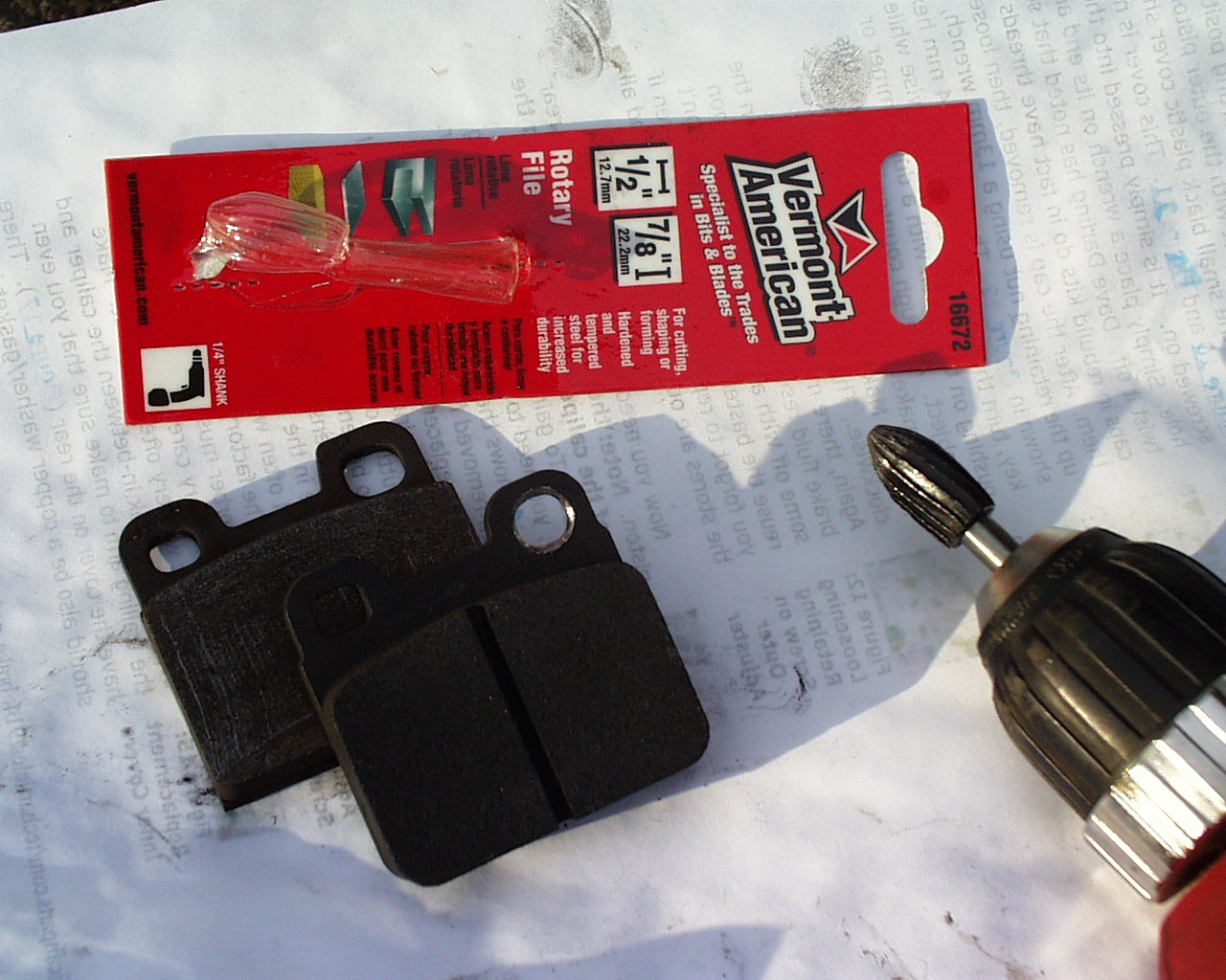 Now that the car is on blocks from last weekends tire slashing, I have easy access to finish the rear brake job. I know it looks super ghetto, but my Alfa is sitting on my jack stands in the garage. Had these concrete chunks left over from busting up a patio in the back. Leaving the new tires off for the long 4 day Memorial weekend in case the jerk offs come back again. Got the rotor screw free with a torch and impact hammer screwdriver. Removed the rotor and caliper without breaking the hydraulic line this time. Decided to hog out one hole bigger on each Porterfield R4-S pad with a rotary file I picked up at Ace Hardware. Found a 5/16 hex wrench that was long enough to adjust the rear pad clearance through the trailing arm hole. While reading through my Pelican Parts instructions I had the a-ha moment that you leave the metal retaining clip off so you can get the feeler gauge straight in where the pads go. After you set the clearance you pull the pins back out and put the cross clip back in there. With the dust shield, there is no way you can set the clearance and the dust shield bolt head are under the rotor which you cannot get to once assembled.