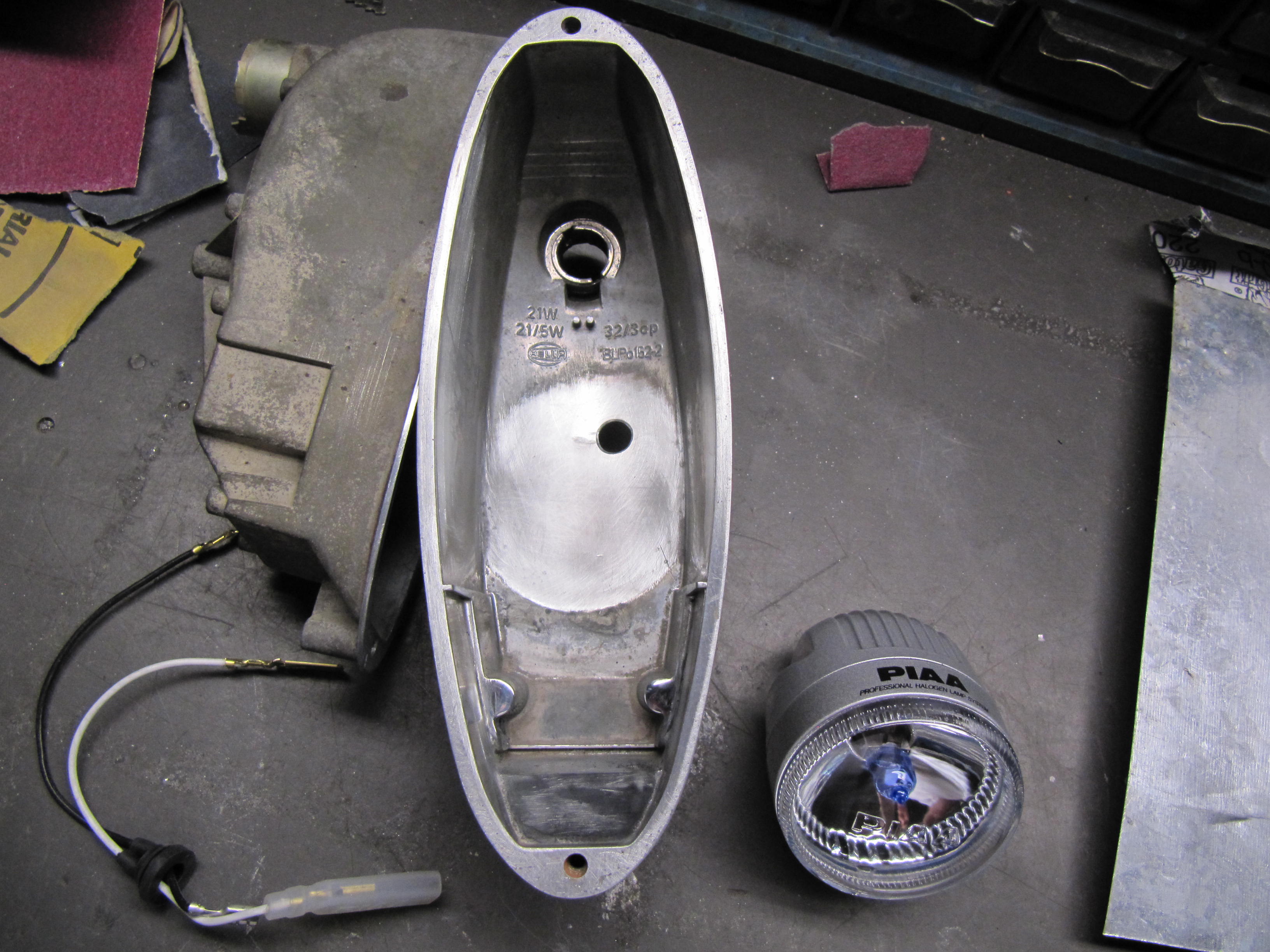 Anything you do will be full custom. The key is having a parobolic lens. Many cheap ones have poor polishing and look spotty at night. BTW, I drove in the SF Bay Area for years with only the stock driving lights. My pop ups were broken. Never got pulled over. Not exactly in the turn signal. That route looks most difficult. These are Nissan 240sx, cut down and fiberglassed. The small round lens on the inside is the HID low beam. It would fit in the turn signal area. It would take some master metalwork to really look good "frenched". A clear/smoked flat plastic lens could be fabricated and this could sit on a bracket in the fender well. Edit: The "halo" LED surround is actually the halogen lamp on the left, sectioned and applied to the driving light. |