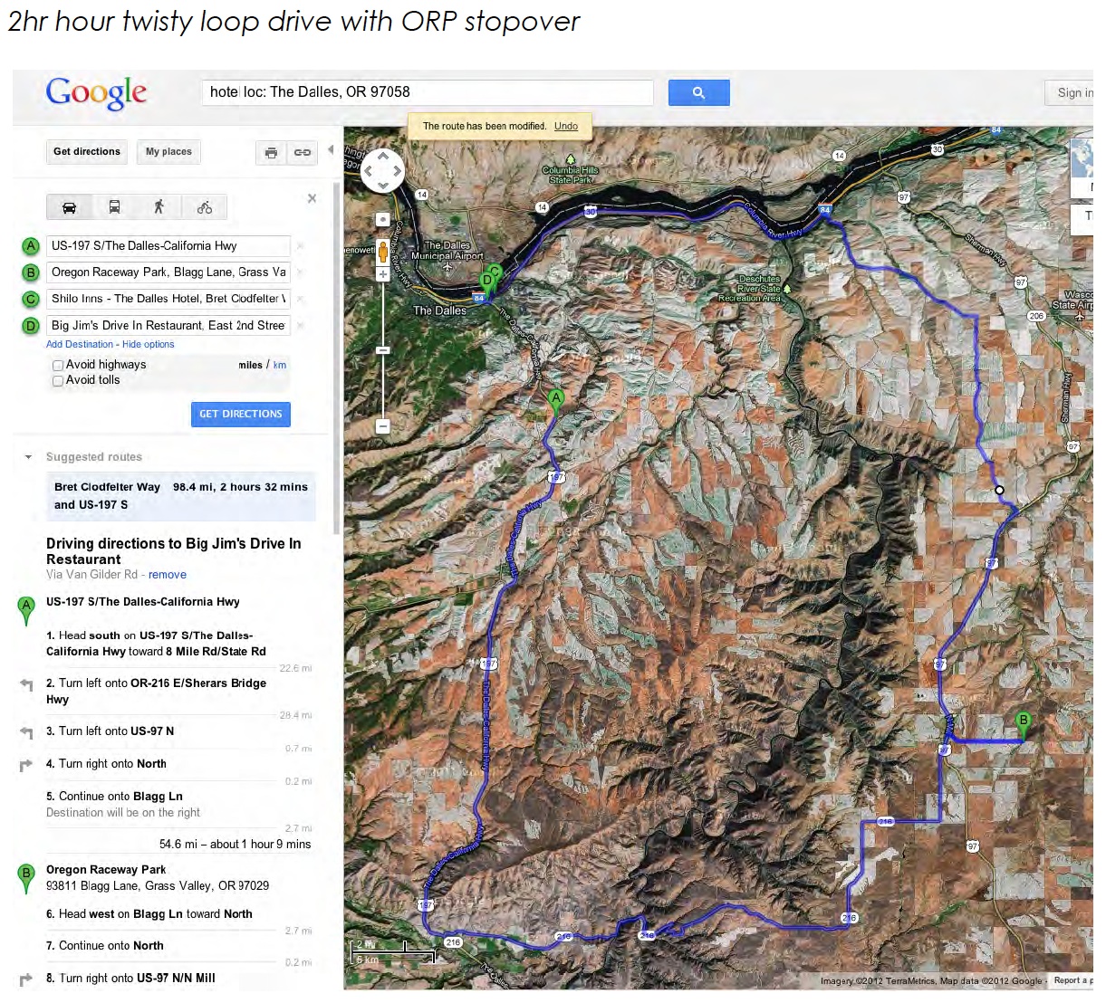 WCR 2013 The Dalles, OR - Shilo Inn, June 13th- 16th (IMG:style_emoticons/default/first.gif) Proposed Bay Area caravan route: - Leaving Wednesday, June 12th - Driving up 101 north along the coast to Bandon, OR and stay overnight. Estimated driving time: 9 hours. - There's a nice motel at the beach in Bandon that we stayed at on our way to the WCR in Seattle. - Leave Bandon early on Thursday morning, continue north on 101 and cut over to Portland using 18. - Pass through Portland and drive east on 30 to The Dalles. Estimated driving time: 7:30 hours. - Going back home is either the reverse (preferred) or if we're in a hurry, we can just take 5 all the way down. (IMG:style_emoticons/default/driving.gif) Attached image(s)