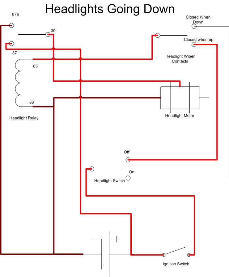 I was thinking about using an aftermarket harness (painless) for V8 car, but couldn't figure out how to do the popups. With this info, I can make the right circuit from scratch. -'Chung |