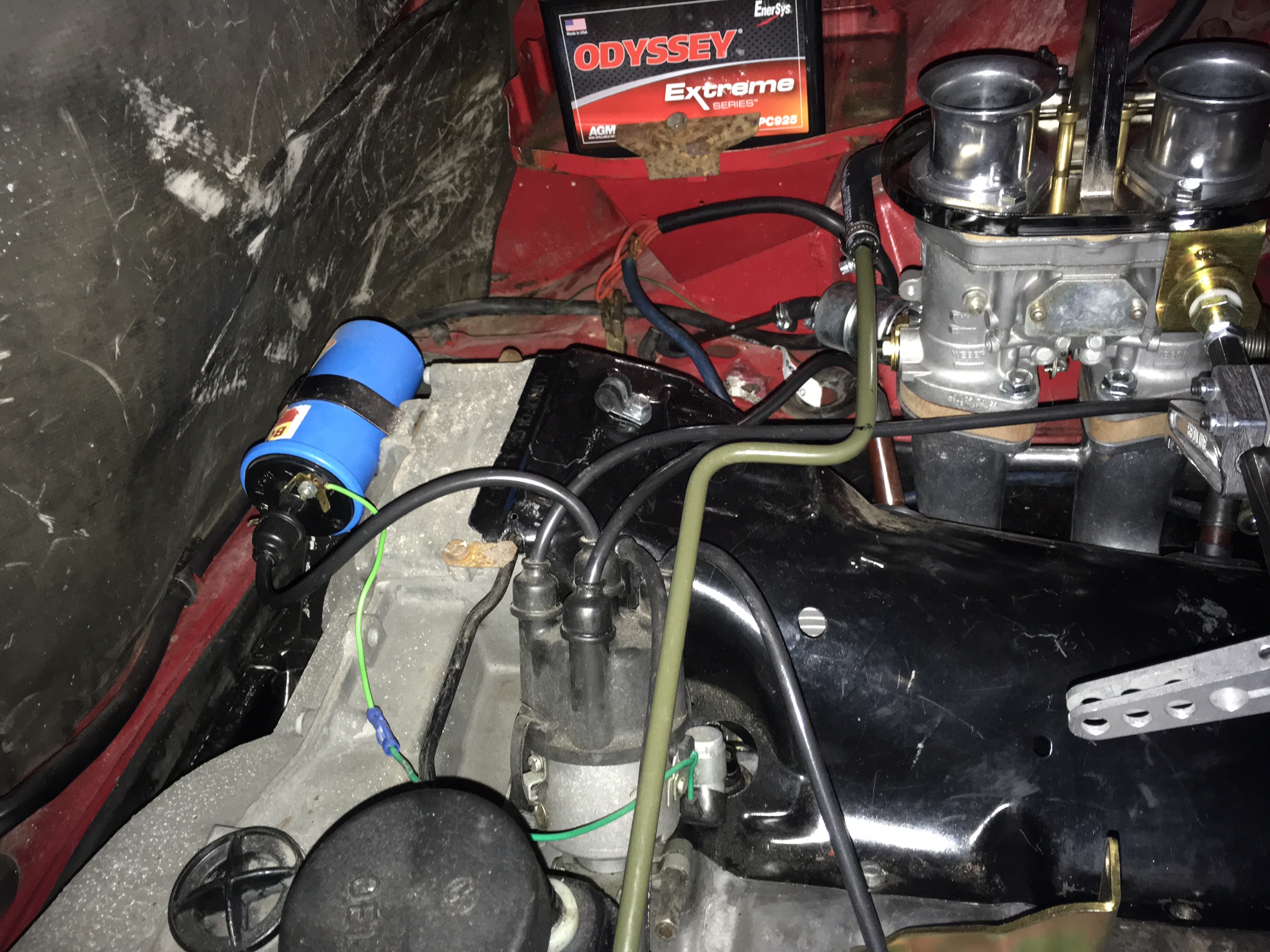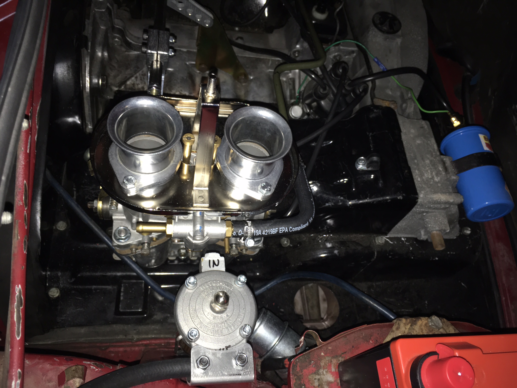 Been doing work on the car but not posting progress, so I'll have to start doing that. Rebuilt the Webers, they are basically in new condition now. There's a new steel fuel line in, rotary fuel pump and fuel pressure regulator. The engine sounds pretty good, but there's a huge oil leak so the motor is coming out for a refresh. I have decided to sell these carbs (40's) because I got a larger brand new pair to take their place.