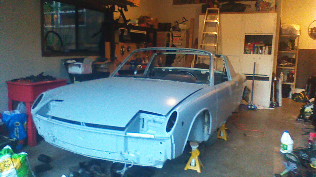 The car is a ’74 1.8L presently on jack stands with both front and rear suspensions removed. Motor and transaxle is removed with plans for a Subaru conversion. Driver side floor pan under the seat has rust which I plan on replacing and of course the battery tray is rusted pretty badly. This was an A/C car so the front trunk had been cutout which I have tacked in a replacement panel from Restoration and Design. The body itself has been blasted and a sealer coat of primer has been applied to protect the metal, by no means is ready for paint by my standards. The underside of the car is as it was from the factory 41 years ago. I have a little surface rust in the trunk area, which is remarkable considering it has spent most of its life in the Pacific Northwest.