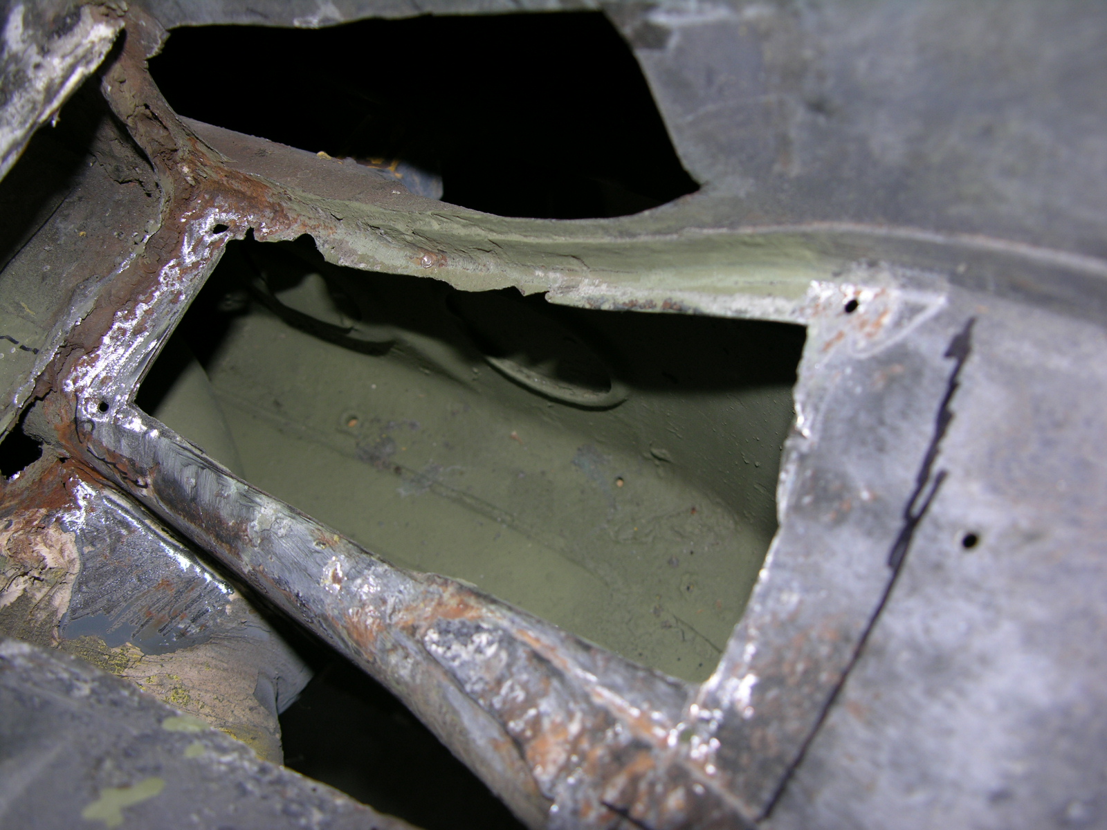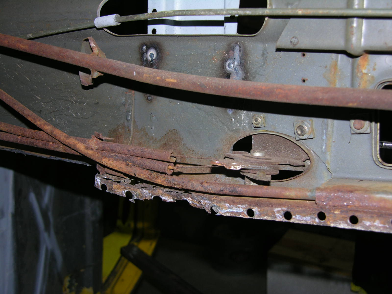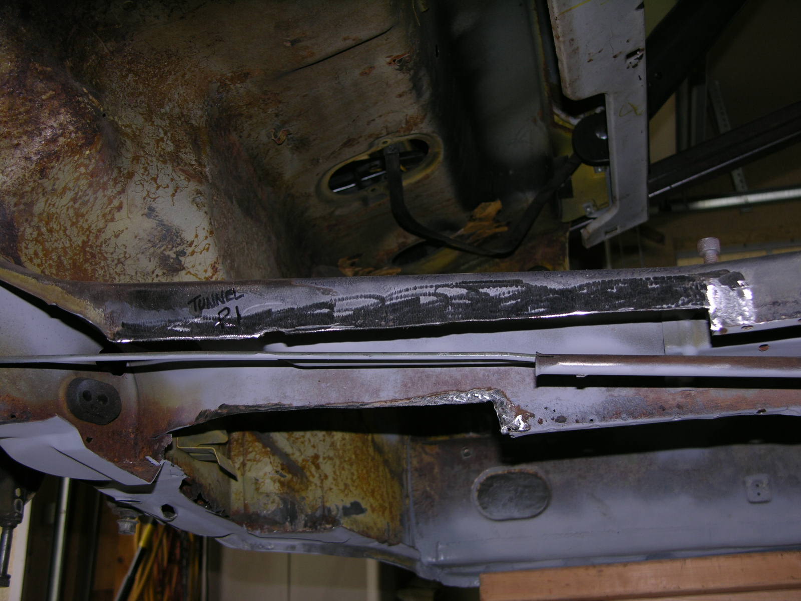 This will be a shorter cliff notes edition. October Floor Pan Fit-Up. Rear Corner Brace Fit-Up. November Stuff TIG WELDER December drilled out all of the Spot welds in the base of the Tunnel. Cut out what I could and prepared myself for what I thought was going to be a rusty mess? It may not appear that this is clean but I expected a lot more rust and was really quite happy with what I found. Obviously I have to patch in three sections along the tunnel in three different areas, but other than that and to shore up several holds on the Clutch tube, I am happy. I continued to clean up the areas with sandpaper used a little Ospho and put a coat of primer on them to keep them in check. This whole tunnel will get a healthy dose of the Eastwood inside panel green stuff and should be good to go. The Restoration Design Driver's side middle brace is next to get welded in and then I will clean-up all the little stuff while I have such good access before the Floor pan is attached. |