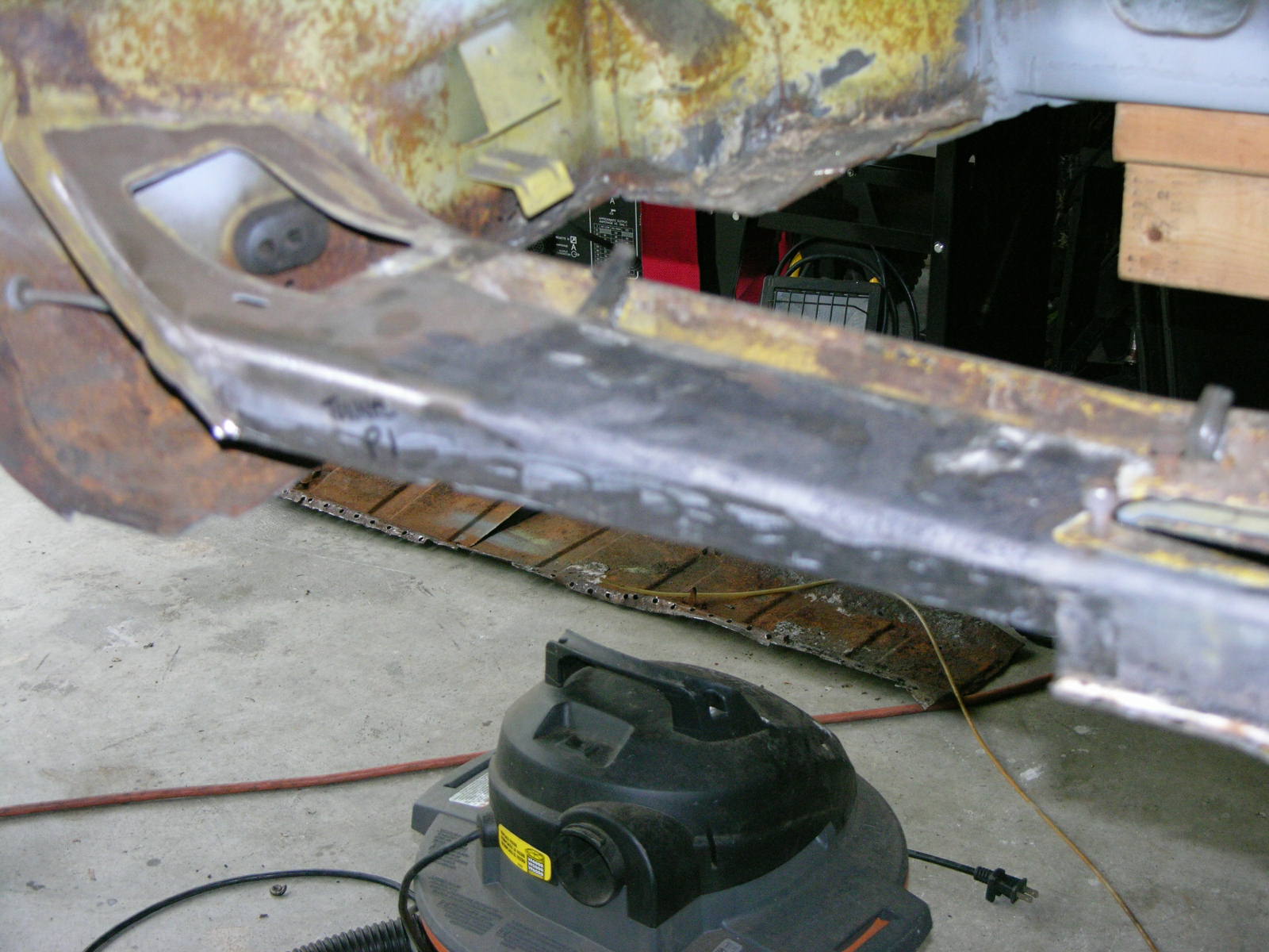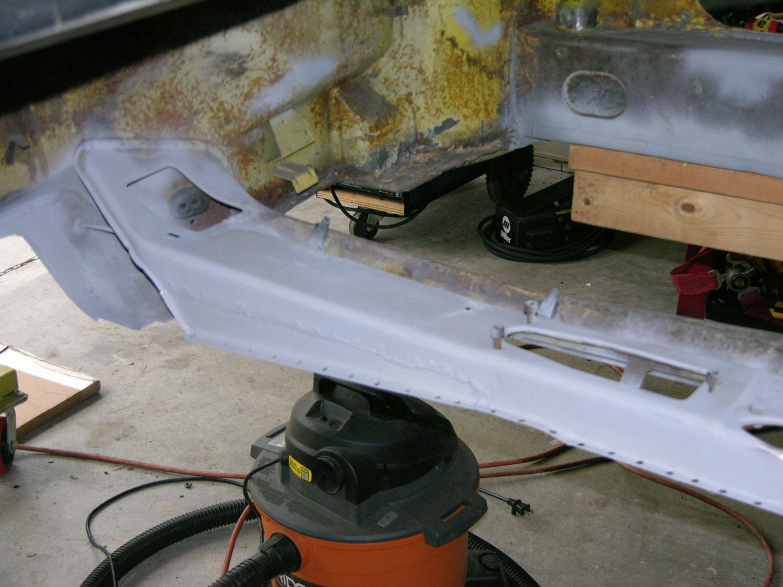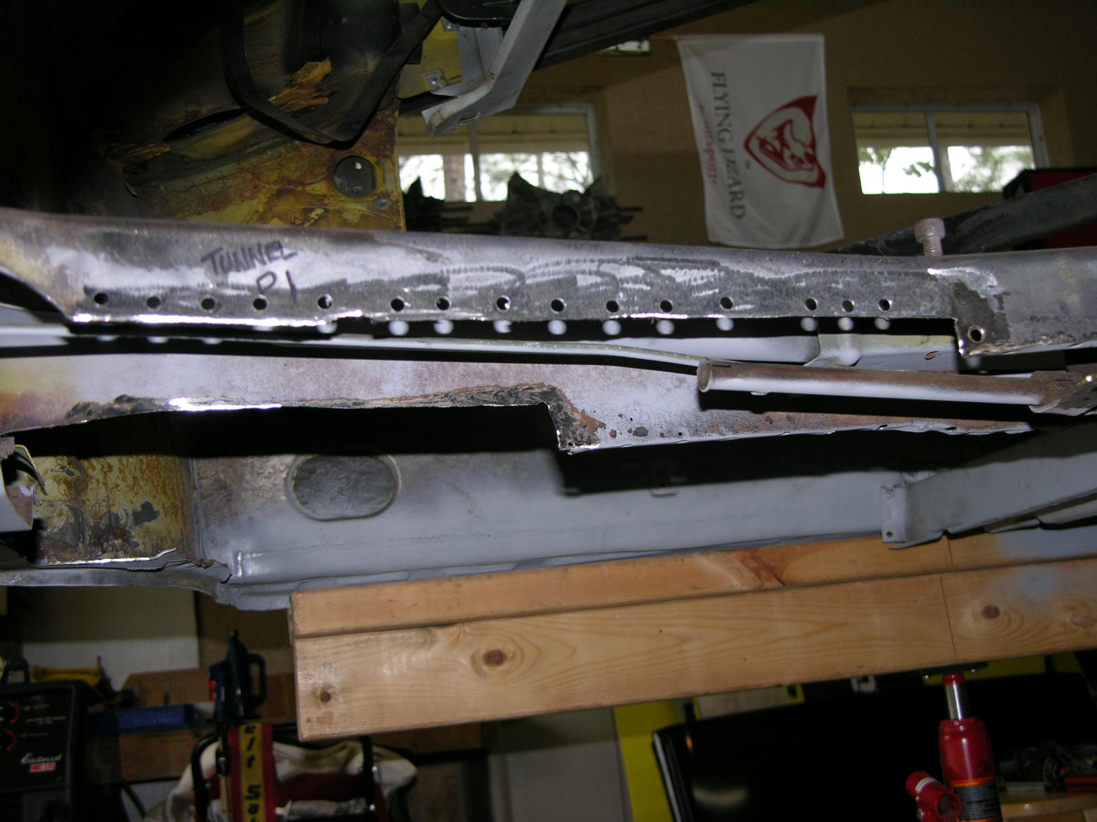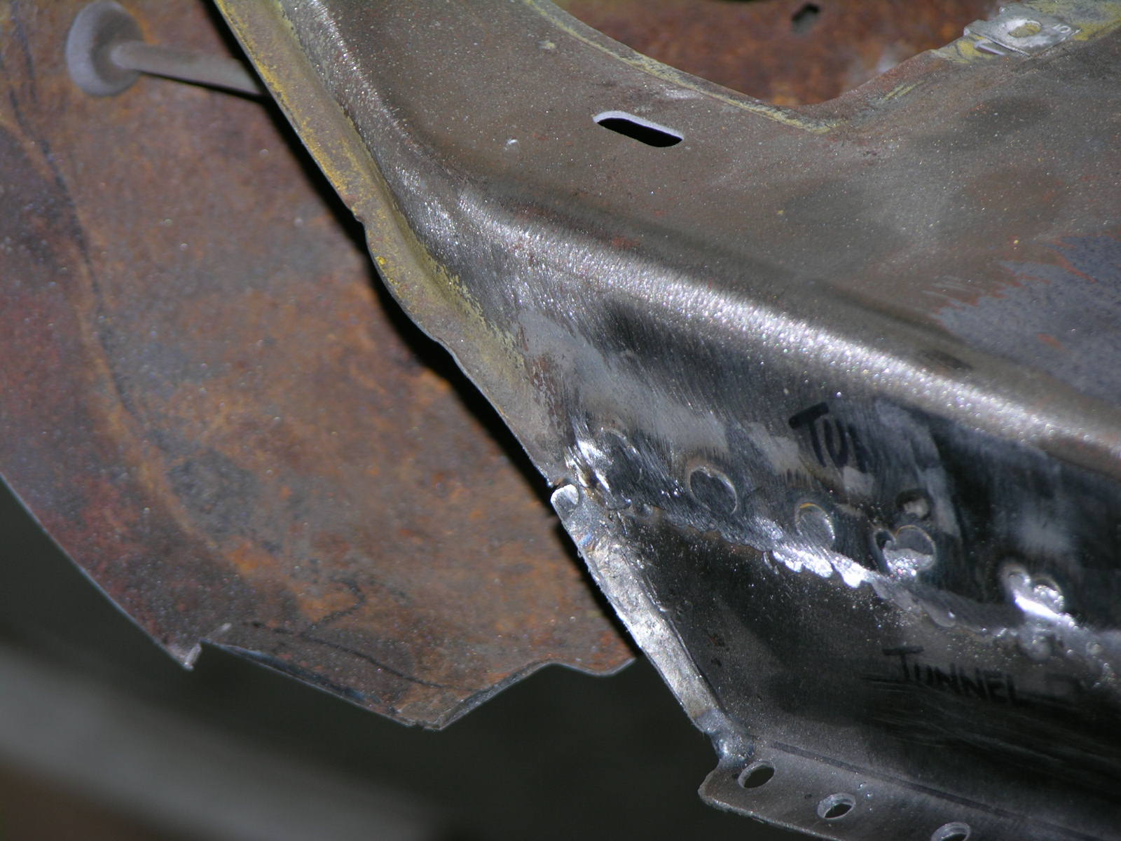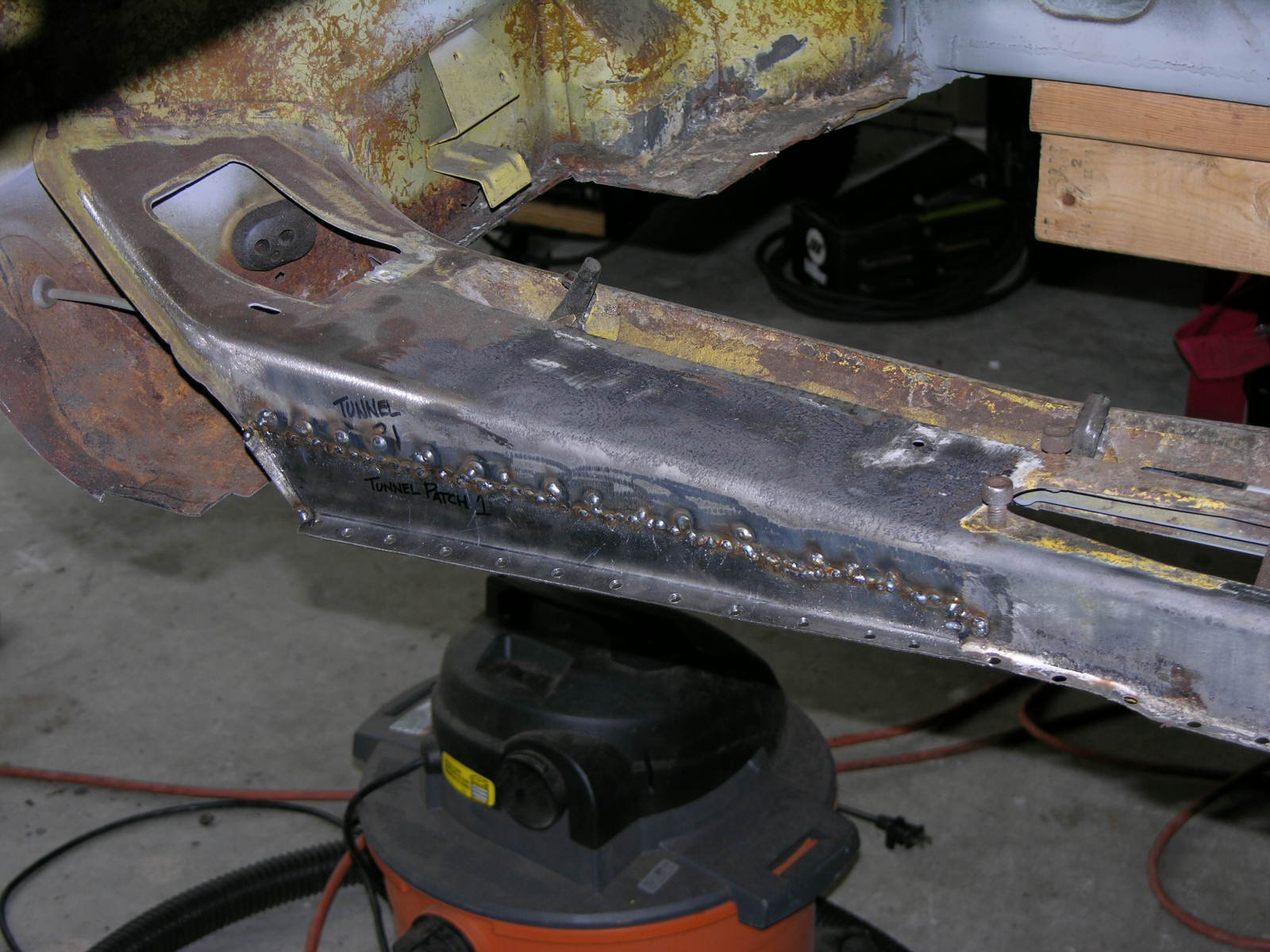 I was able to take advantage of Thursday the 10th of December and get the 1st of 3 patches welded in on tunnel. Working with the new TIG welder has strangely helped with my thin gauge work on my MIG welder. Anyway things were grabbing very nicely and I was able to really get things dialed in on Thursday. I feel like for the first time that I may be creating some forward momentum on this project. Here are a few photo's of what I got done the other day! Prior to patch, as you can see water must have sat at the base of the tunnel in several places and the tin worm did his thing. Another photo of area to be patched - Tunnel Patch 1. Pattern Designed & Test Fit. Second Test Fit. Sheet Metal cut out and formed up. Tunnel drilled for rosette welds and prepped for MIG. New piece clamped in with C-Clamps. In place and ready to join the Yellow Sub forever. Another Angle. First welding pass with the MIG. I think that will hold it. Another Angle. First pass at grinding & sanding of the welds, please remember that this area will be covered with Dynamat and carpet other wise I would have done pretty butt welds. Close Up of the edge, was even able to tie in the little openings on the lip where they attached. In primer. On to the next patch! More coming, once the other two patches in the tunnel are accomplished I can weld the Driver's Side Middle Brace in from Restoration Design! Thanks, Vysoc (IMG:style_emoticons/default/flag.gif) |