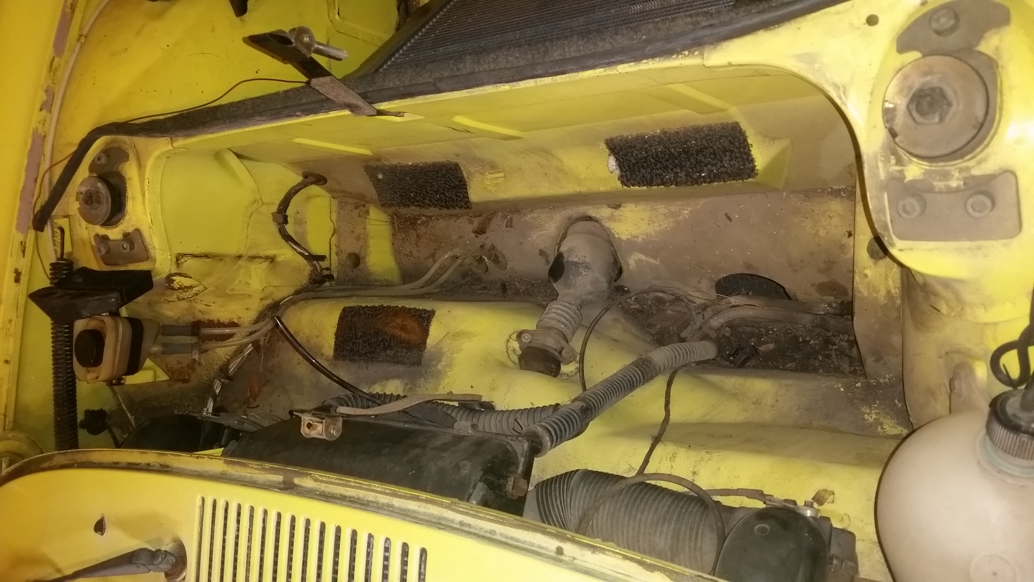 Below is my list of work to do. Pull Fuel Tank Replace stock fuel lines Plumb fuel pump Replace firewall shift bushing Cut holes for radiator lines in front trunk Mount radiator lines Cut notch for HEI Dizzy Clearance valve cover Bolt up engine/trans Bolt up cv joints Install shoft linkage and adjust Install distributor and carb Install clutch, throttle and speedo cables Wire starter, dizzy, alternator Test fire Flush coolant Bleed brakes Drive Total hours involved is anticipated at 26 by myself. I origially agreed that the owner would have the car 100% ready for the swap and I would only have to do the v8 portion, (which I have a anticipated at 20.5hrs) however the fuel line issue, firewall shift bushing, and bleeding the brakes are all going to be done on a T&M basis. Overall its a good looking body with a few dents and paint that shows its age. There is a bit of rust in the firewall and battery tray and some in the pass front door jamb, but the rear suspension console looks great. I think its a great candidate for a conversion. |
