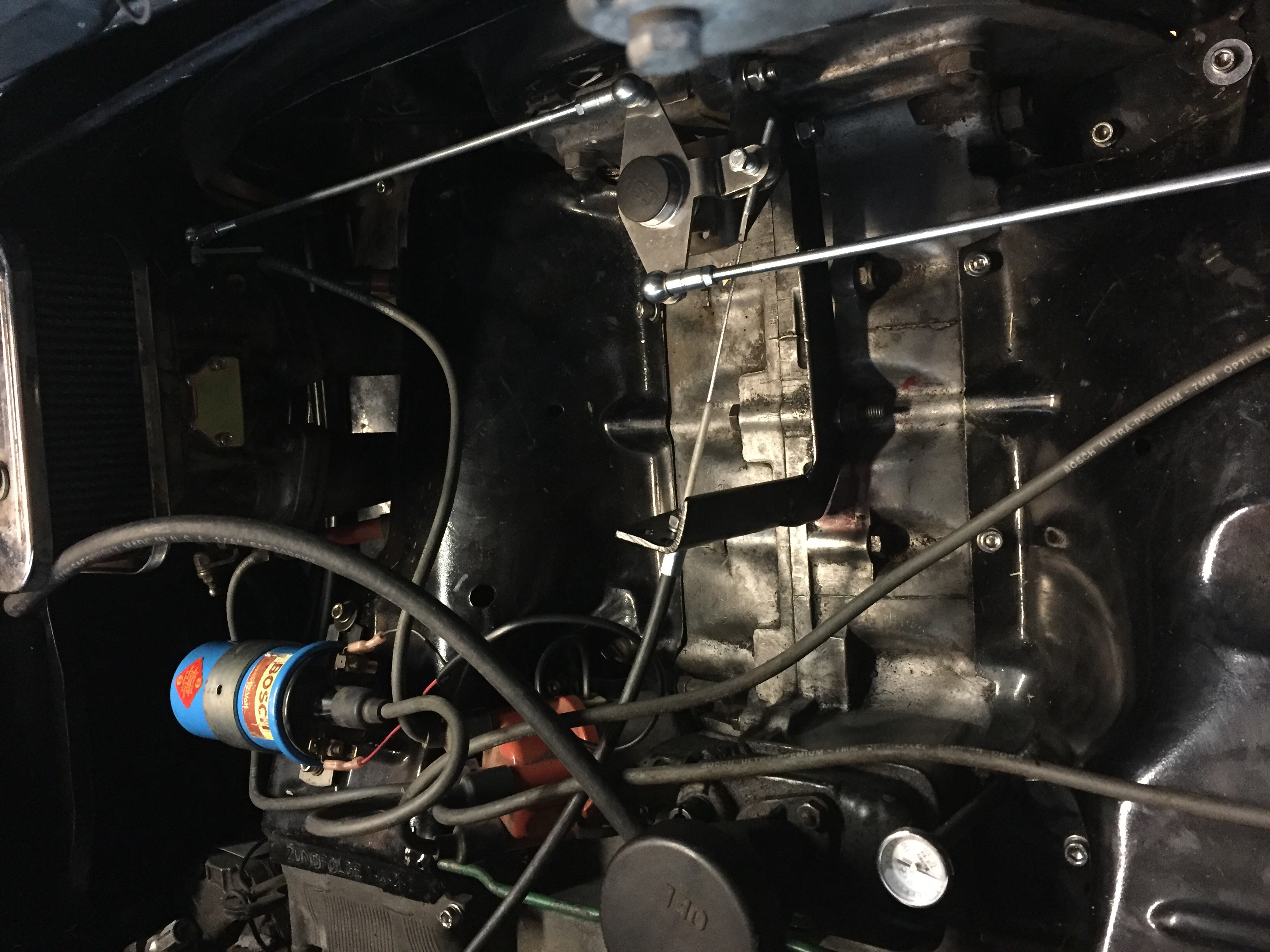 In putting Mark's engine back in and replacing the broken accelerator cable. It seems the cable isn't quite long enough to work/fit correctly. In the FI arrangement the cable crosses the engine at 45 degrees. In dual carbs it needs to come at the bar at 90 degrees. Which pulls the bowden out of the firewall. Which will allow water down the cable tube.