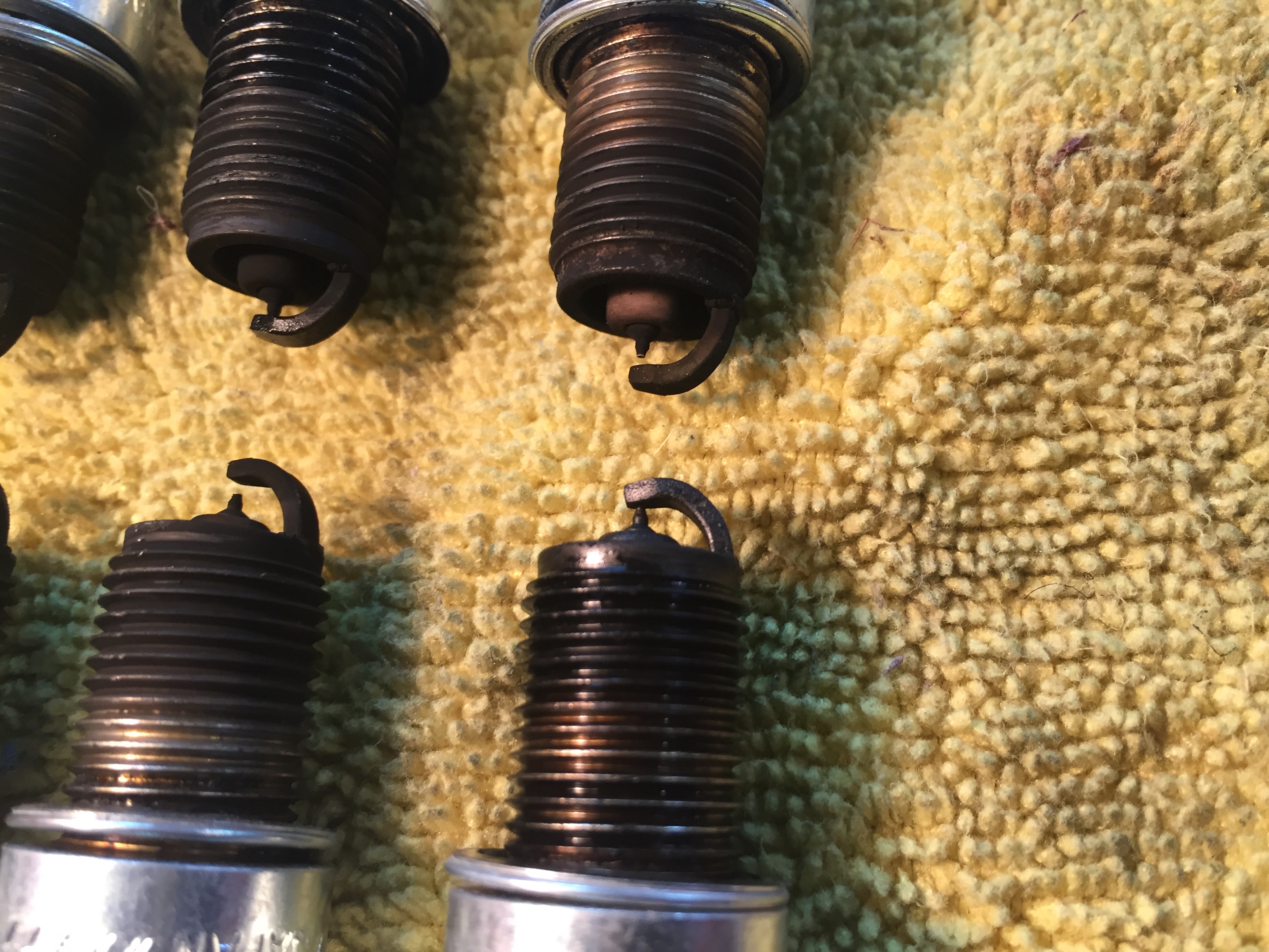 Carbon buildup on the pistons are usually the culprits,running way rich and or lousy valve guides or poor ring sealing. A short term fix is a shim for the plugs,to recess them up,away from the pistons. For sure use copper formula antiseize on the plug threads. After reviewing the photos again, I believe this is your problem. The fact that some are touching and others are not leads me to this result. The plugs are certainly carbon fouled. I also agree that shimming the plugs would be a temporary fix. Getting to the source of the over rich situation is the real issue. Fuel, valve adjustment, timing etc. Good Luck! |