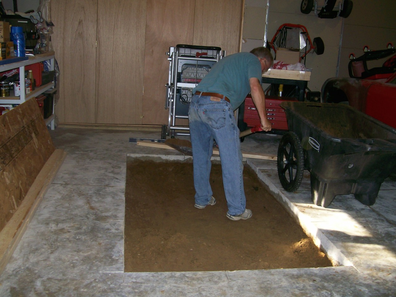 Harpo, I did have a friend to help....but the process went like this. Rent cement saw( the one I got was new with new blade) it cut the 6 bag mix almost as fast as cutting wood, could not believe. Then dug the sand out, down about 16 inches. The cement pour is a two step process, first pour base making sure it is level (my floor has a pitch to the floor drain). Then next morning framed up sides with a little rebar into the base. Second pour. Done.