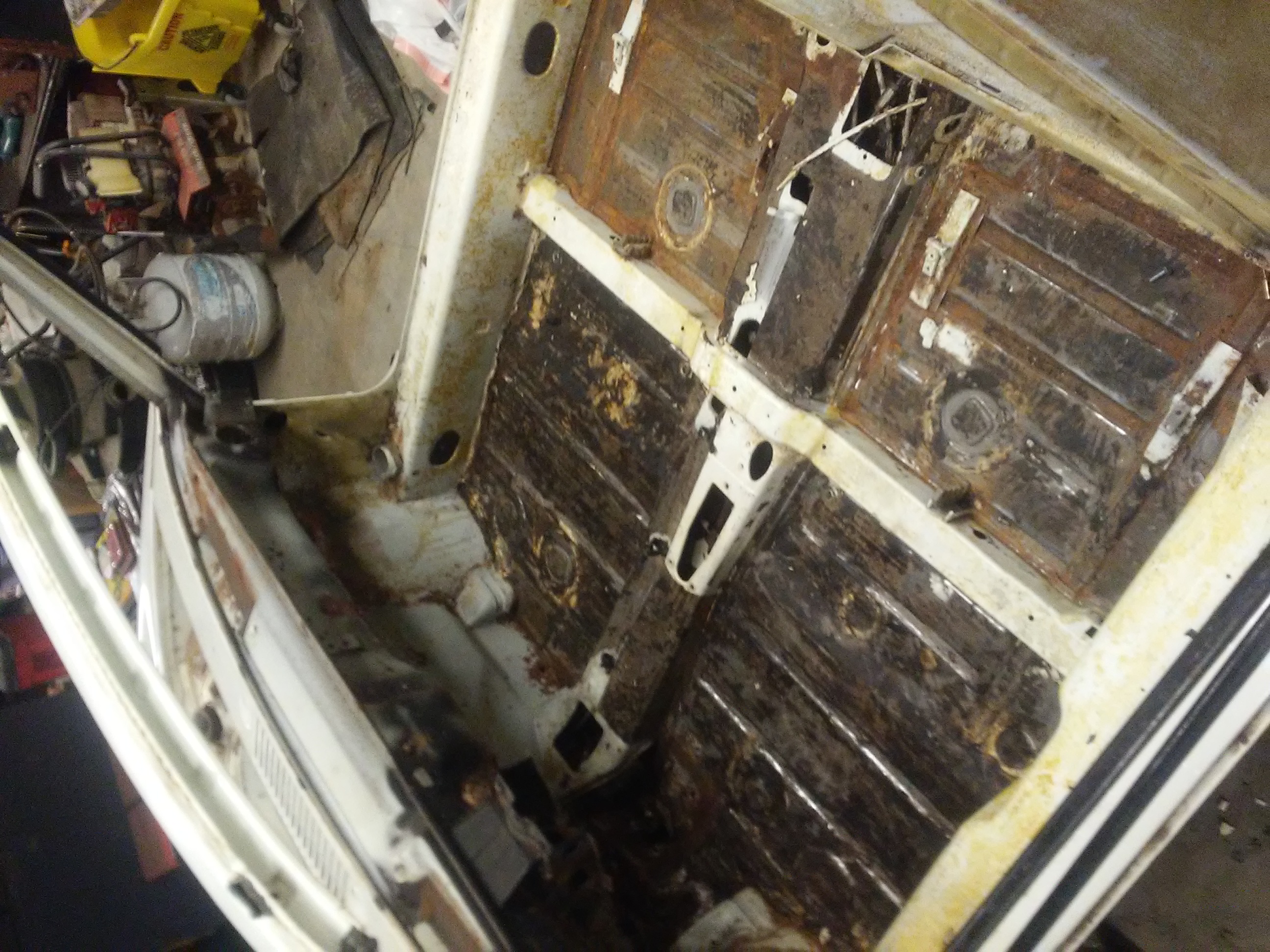 The backstory is that Wes got it in Oakland where it had sat behind a rib joint for some time. Apparently, some rodents made a home in the air box. They also acquired a taste for ribs. It appears the brought a few back with them. They were there for some time, and urinated eating the bulkhead out. The hell hole and floorboards look good. The pan is intact and looks good. He has a bunch of work ahead of him, but it will get restored back to stock ivory white. Attached thumbnail(s) |