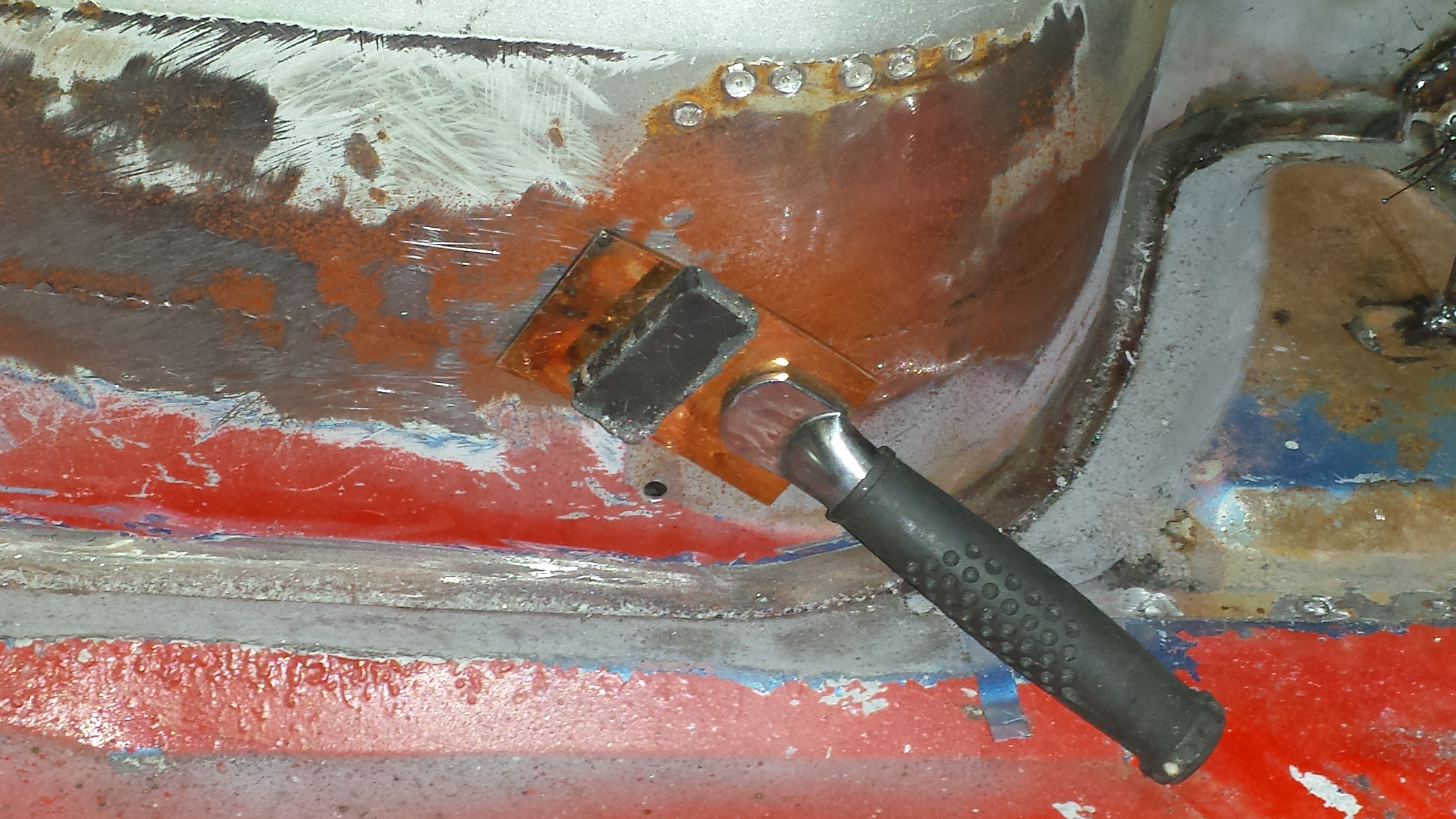 I weld at high power, so the weld penetrates quickly, and just do tack welds. That looks like how you're doing it as well, but if you're worried about penetration you may need to step up a bit on power. Pictures of unground welds would help as well. You're well along the way to making invisible welds. One very important thing to keep in mind is that the perfect weld (like most things) happens in the prep phase. Make sure both sides of the metal are ground clean and bare, make sure that the patch piece is well fit before you start. Never try to work the metal into place as you weld. And finally, be very careful about how much you grind your welds. You can't MAKE a bad weld into a good one by grinding more. You'll end up with paper thing metal that looks good when you're done but will crack or if you have to weld near those grinds again you blow right through. It can help to think of it this way -- you never want to grind the base metal (the sheet metal), you only want to grind the weld material. And then it looks how it looks. Just throw another few hundred hours at it and you'll get it. (IMG:style_emoticons/default/shades.gif) Thanks for the tips! Here's a pic of the weld with maybe 25-30% of the tack welds complete and before any grinding. ![]() Like a dummy, I forgot to get pics after all the tacks were in, or of the front of the weld. (IMG:style_emoticons/default/headbang.gif) That googe in front of the reinforcement brace weld points is because there was still some minor rust pitting in a small area and the fender scrap I had for the patch didn't quite reach. My process was to make a dozen or less tacks skipping around the panel and then going off to do something else while everything cooled down before going another round. When finished, I used a cuttoff wheel held perpendicular to grind half inch segments of the weld heads, again skipping around and taking breaks to let things cool down. I ground the heads to just barely proud of the parent material and then finished with a 3" sanding disc. 36 grit just enough to bring the weld flush and then 80 grit. At the stage of this pic, it looks like the penetration is pretty good with a couple exceptions at the radius. I think the penetration issue happened as I was closing up the gaps and there was more material to suck heat away. I'll experiment on some scrap with higher power settings. For this particular weld, is it time to stop futzing with it? Seems like any more work risks either getting into parent metal or adding heat to warp things. Thanks again for the help. Much appreciated! (IMG:style_emoticons/default/aktion035.gif) |