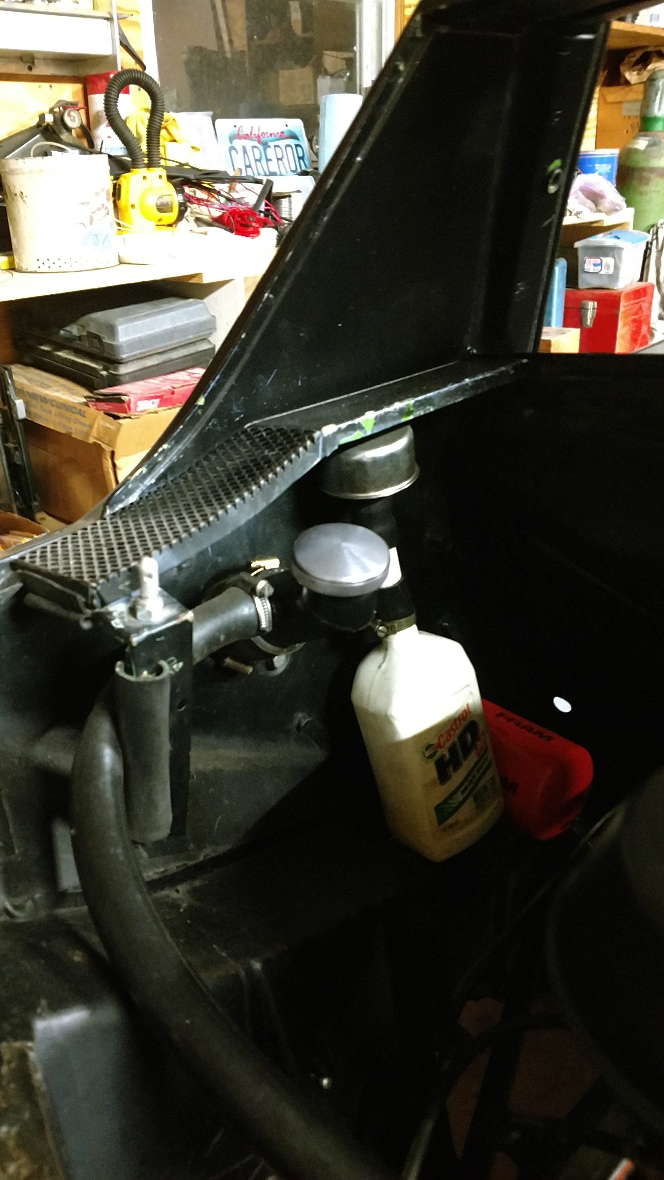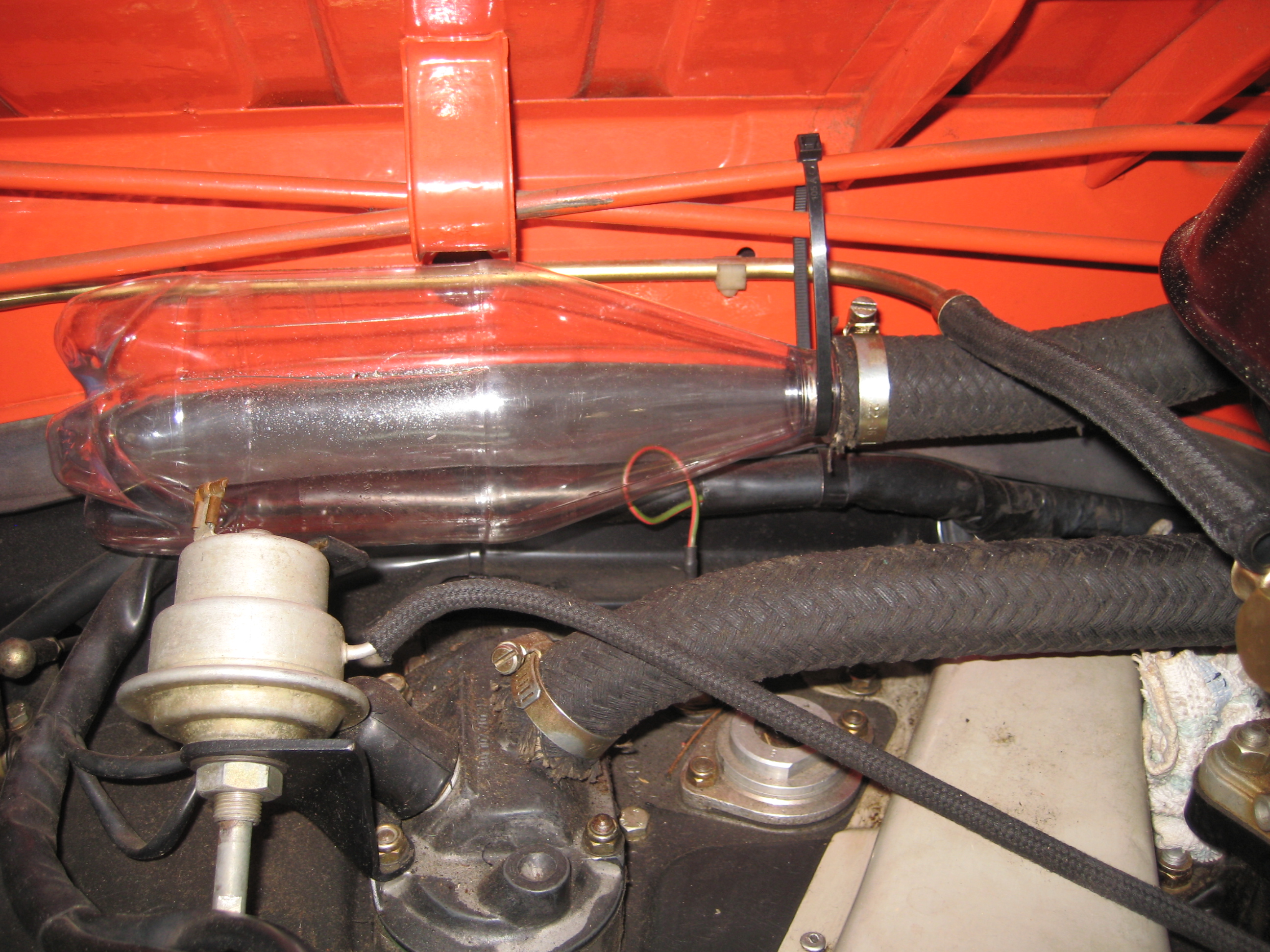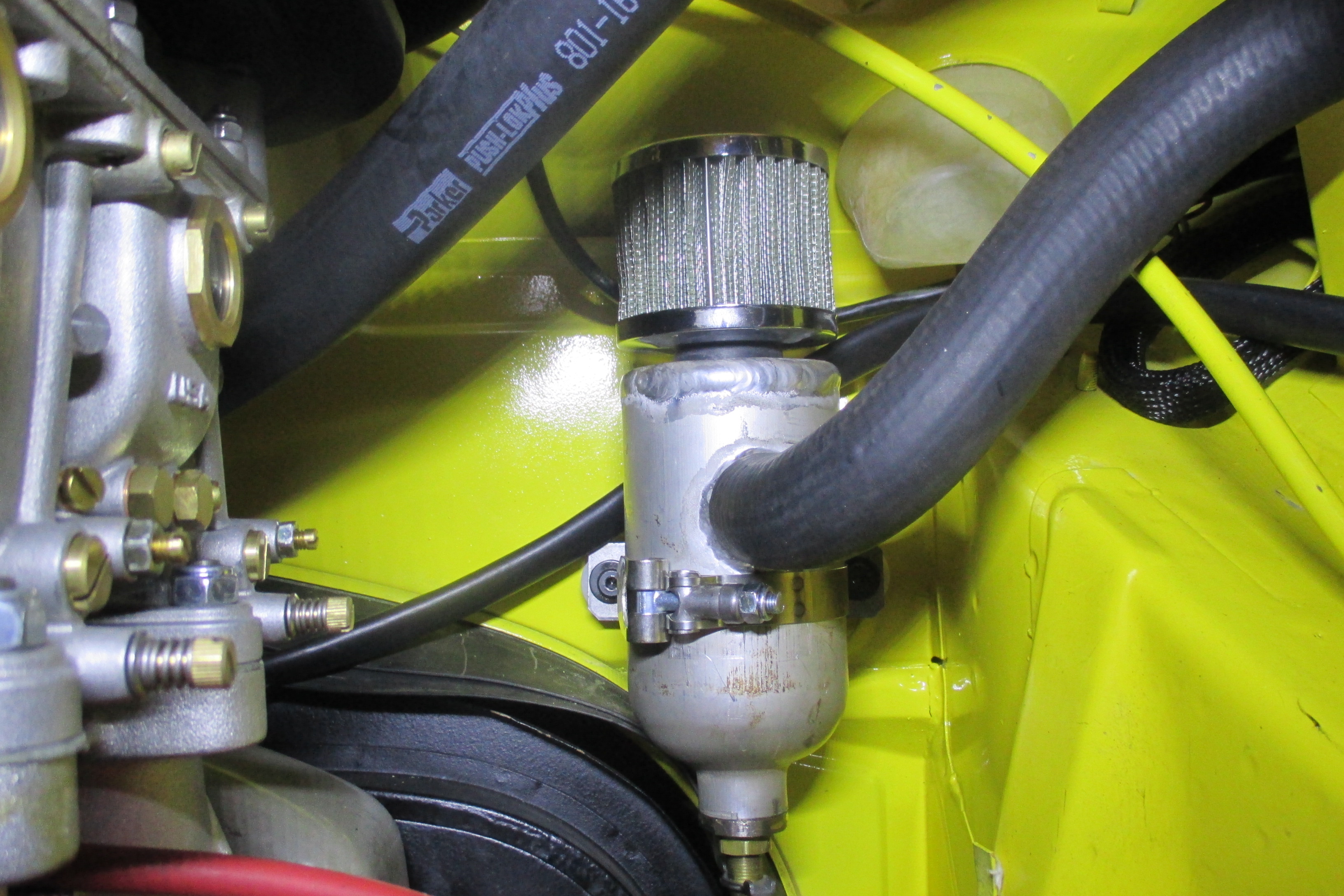 Here's mine in the 6 on the firewall right behind the driver's seat. It's a modified hiking water bottle in powder-coated aluminum... for the budget conscious builder. Hardly ever gets any oil in it. K&N breather filter. Ron ![]() Very creative and nice looking, the German clamp is a great touch! Like "for the budget conscious builder" because at this point it would be cool not to spend much on this tid bit. Great ideas so far! Thanks (IMG:style_emoticons/default/white914.jpg) |