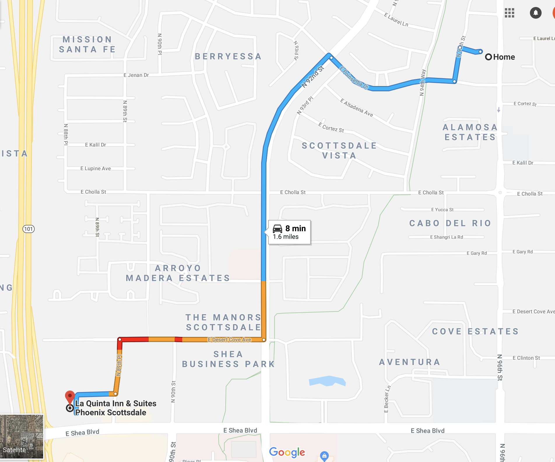 To clarify.....the hotel that is close to PMS is NOT close to my house. So, I will shop around near my house and see what I can find. I am currently working with my daughter and her friends to run shuttle service that night for those of you that want to enjoy cocktails and get a ride to a near by hotel :-). Please stand by.... For those of you following on Facebook, go HERE! Currently, the best price for a hotel by my house(a mile away) is here - Thursday Night hotel Thanks Mike. The La Quinta Inn in Tempe is 20 miles from MoveQik's house. |
