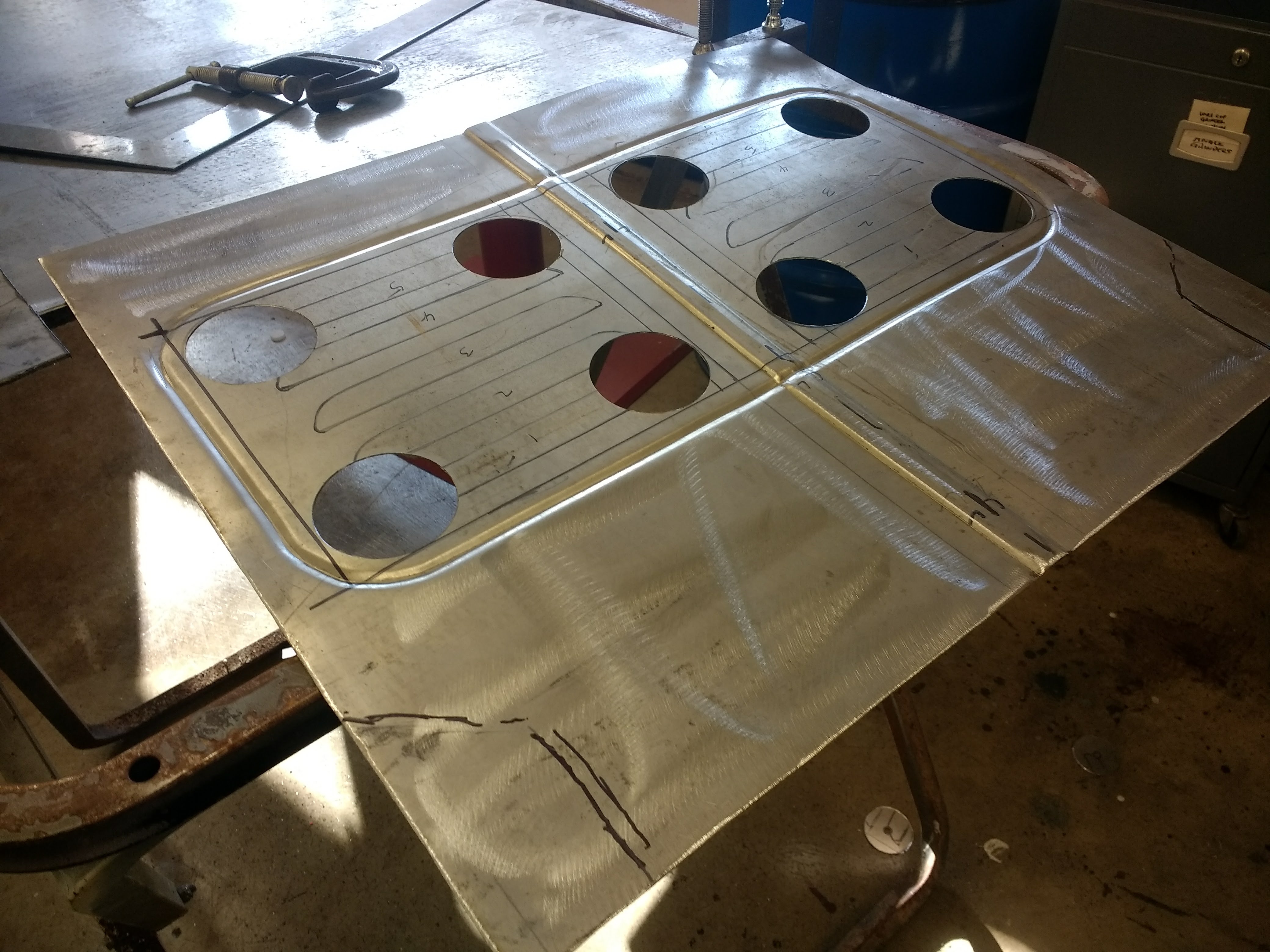 Note the 'pointy' jagged ends at the rear of the hole. I have a lovely hole in on the back of my left hand from one of them where it attacked me through a leather glove. I'm about to get even, and fix the problem forever. Make a Sharpie layout for the new floor and include area for exhaust of hot air and size of louvers: Then, cut the radiuses with a hole saw; Run a 'bead' with the bead roller around the outer edge of the future opening, and roll a step fore/aft down the middle to stiffen the floor; Weld in the floor after removing the new holes where the future louvers will be welded in. Lets make a couple of louvered panels; Pictures take up too much room, Next Reply Please Bead roller with louver dies installed. I'll roll the dies over the layout on a piece of 20 gauge steel sheet. |