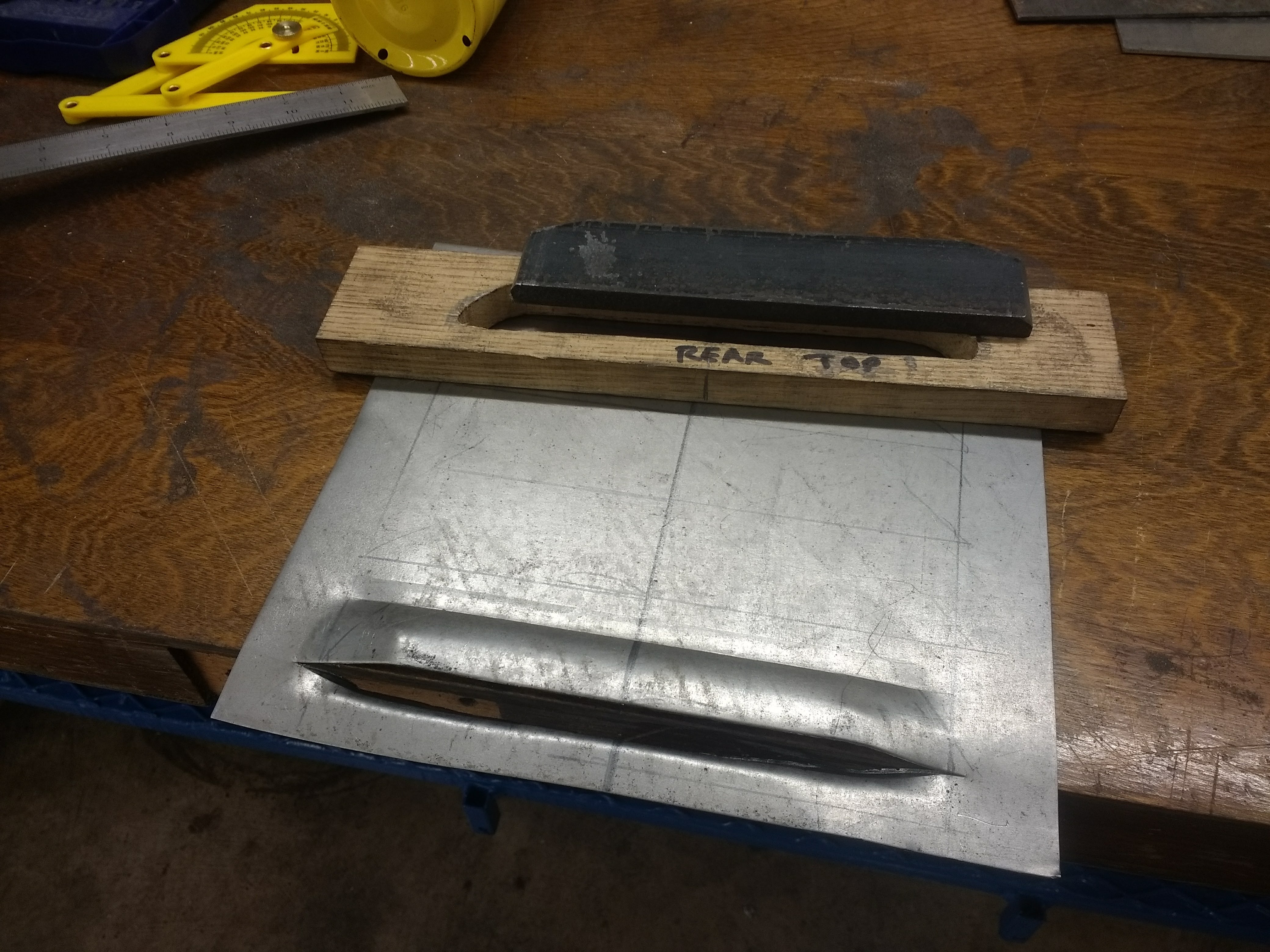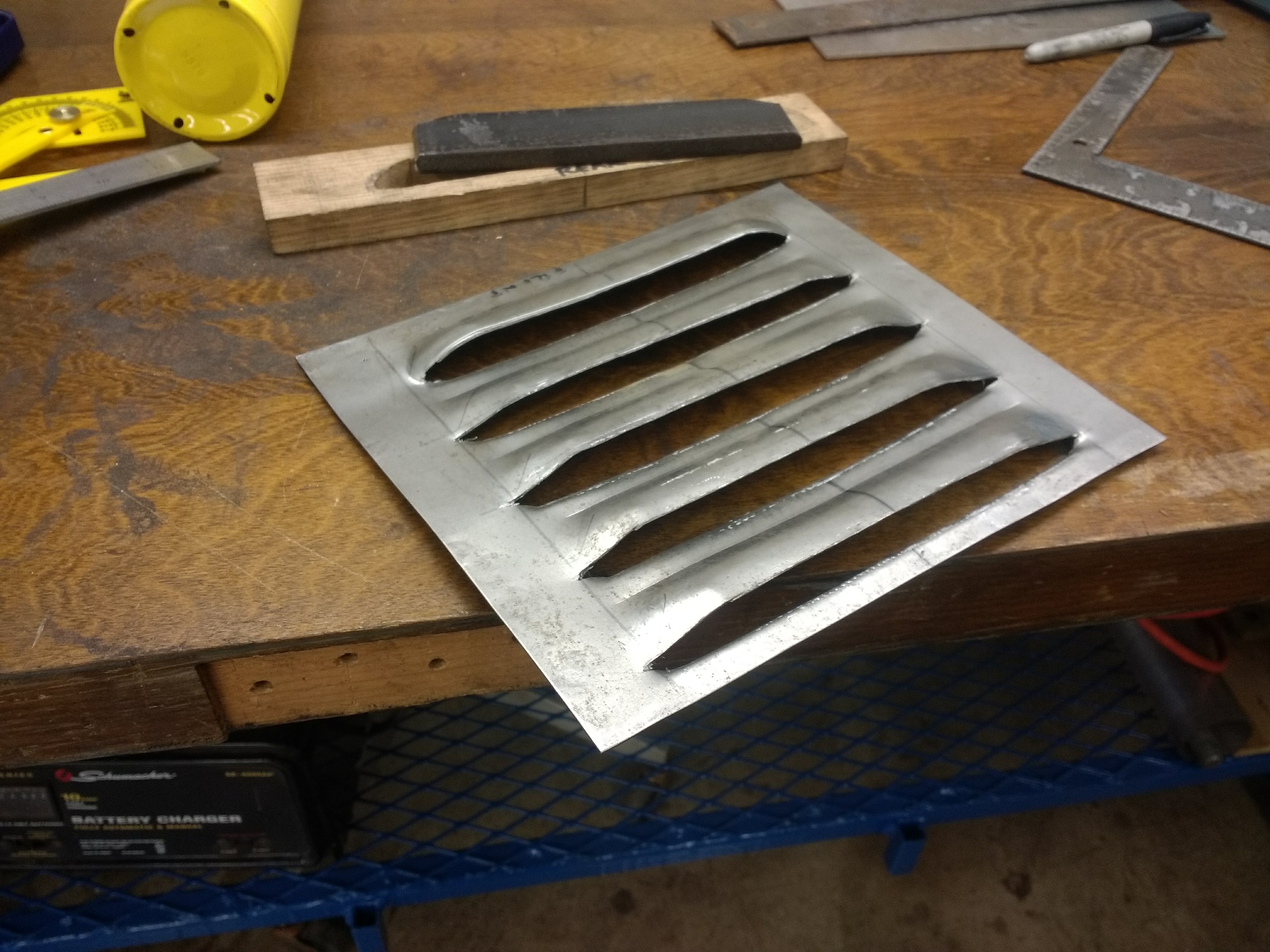 Bead roller with louver dies installed. I'll roll the dies over the layout on a piece of 20 gauge steel sheet. Here is what the new panel looks like with one louver rolled in; The wooden block and steel bar in the back of the louver are a homemade die to stretch the metal and make the louvers more consistent. OK, I need to find out how to make my images smaller....... not enough room for another picture!!! I've tried Ribbet resizing tool, it does not work with Google images, Google Images where my pics are is absolutely no help. My phone's camera will not let me choose my picture size. |