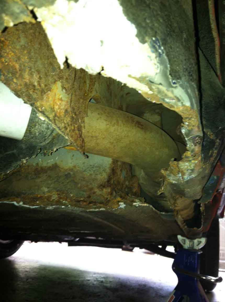 ![]() Additional rust excavation revealed that the fiberglass on the floor was a poor attempt to seal up the heavily rusted floorpan. In the picture below you can see clear though the floor pan on the passenger side where it attaches to the longitudinal. ![]() |