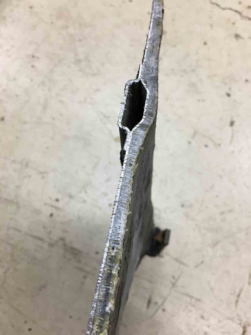 I previously mentioned the fiberglass on the floorpan right? Well, upon getting the right side longitudinal cut out ![]() and sectioning the floor, it seems that someone thought they were building a boat. I understand the idea behind using fiberglass to seal up the pinholes in the floor pan. I don't think 1/4" of mat and resin was really necessary. (IMG:style_emoticons/default/WTF.gif) |