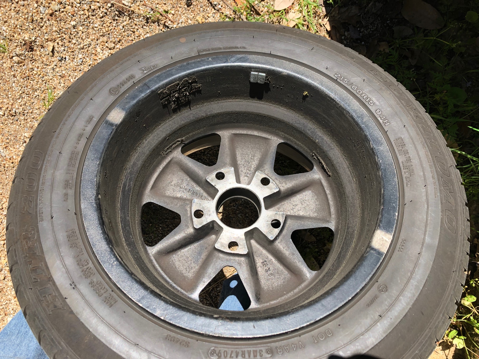 Two 7Jx15 and two 8Jx15 replica Fuchs. I used these on my GT replica, no issues with them; I just switched to different rims. The rims are in good condition but there are some minor scratches and road rash. The tires are 205/60/15 and 215/60/15 Sumitomo's which still have a bunch of tread left. No center caps.