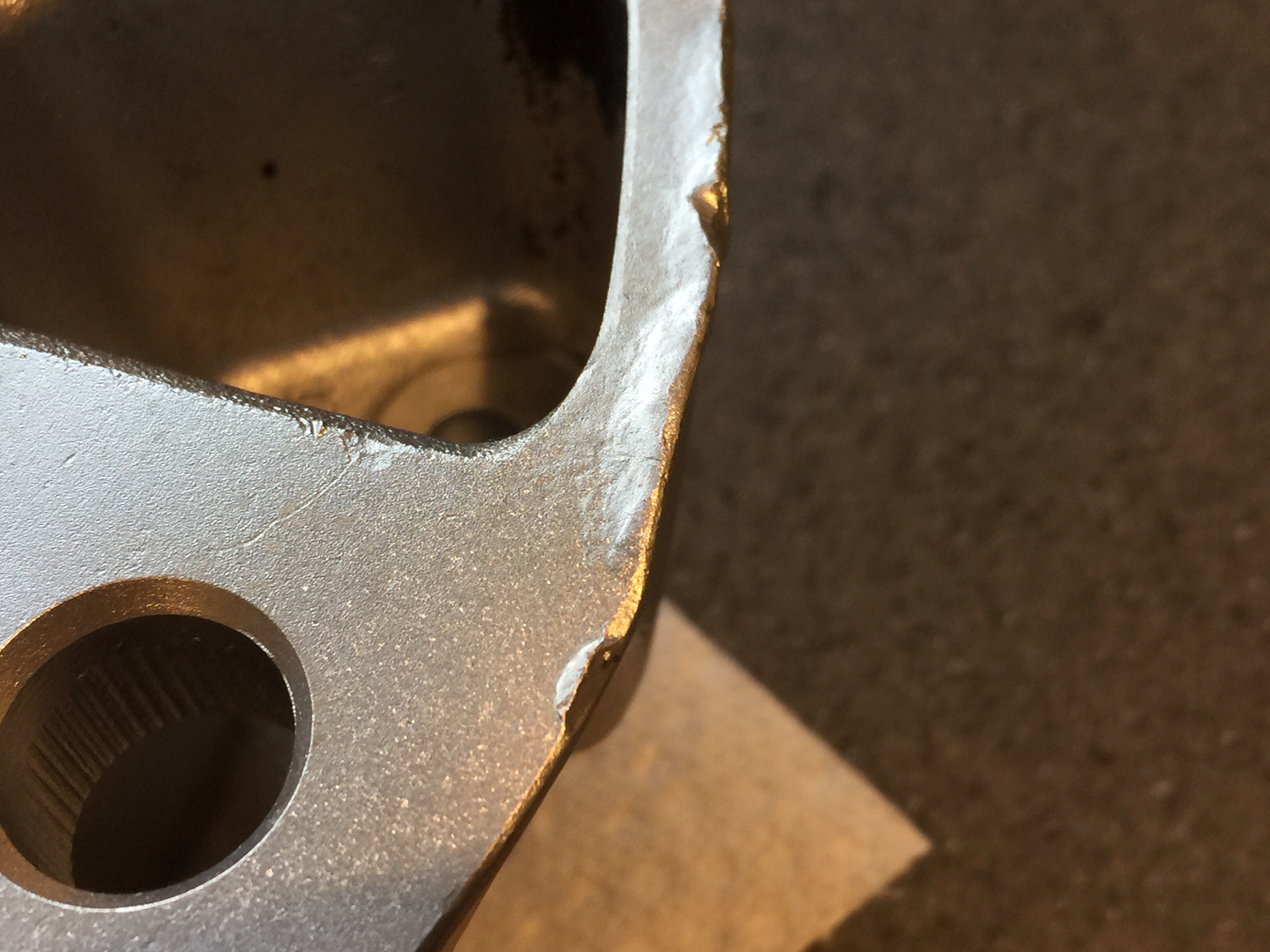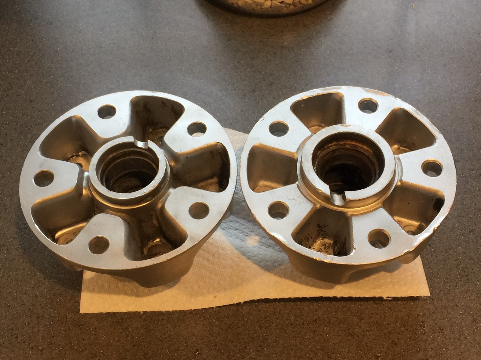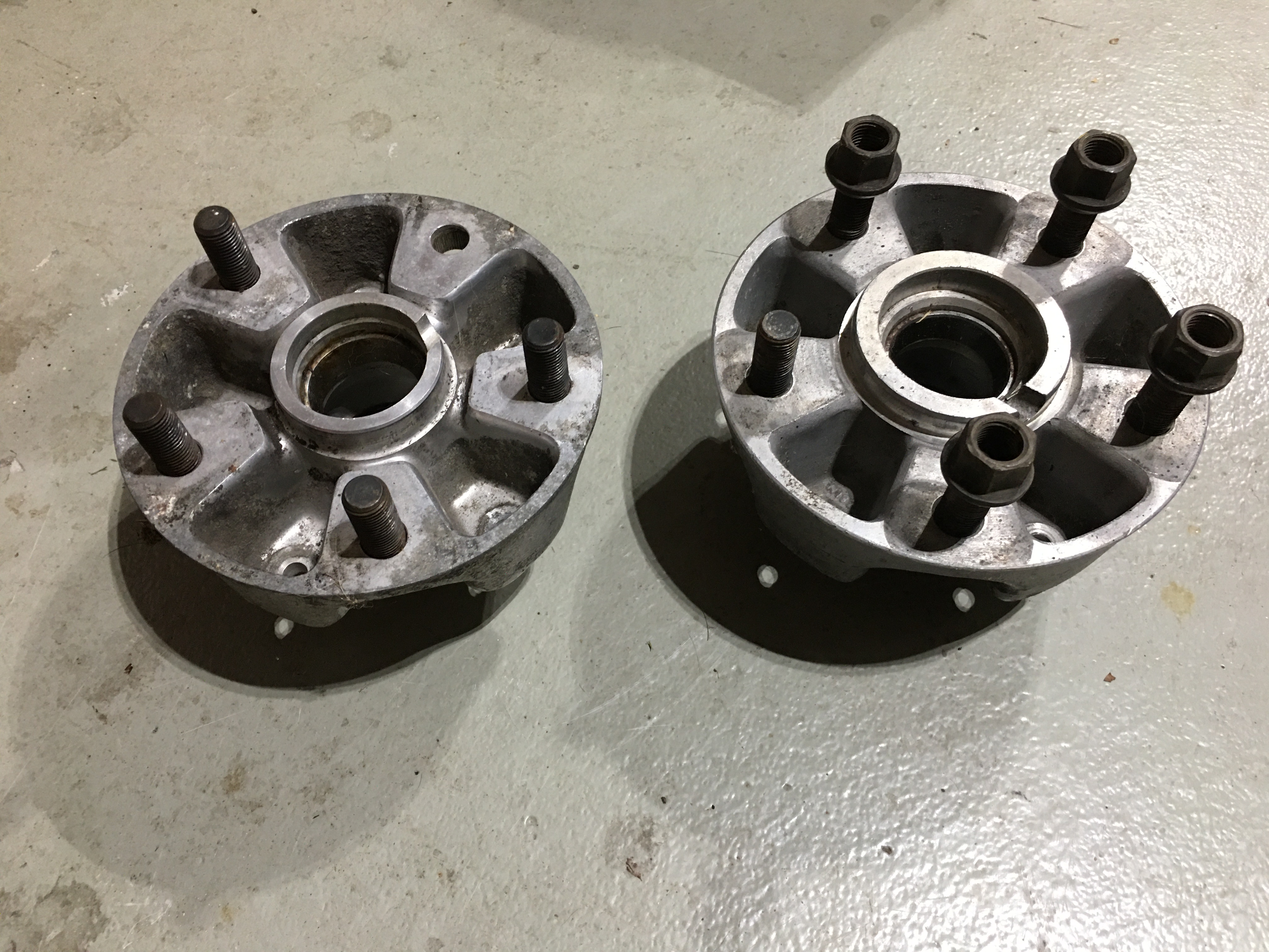 Ken - here’s the two hubs. Early hub is in great condition. Later hub must have gotten dropped on the edge. Will need the bumps filed so the rotor sits flat on the face of the hub. 5 minutes with a flat file should do it. No studs on either hub. Let me know which one you want and we’ll do the trade. Thanks, mark Attached thumbnail(s) |