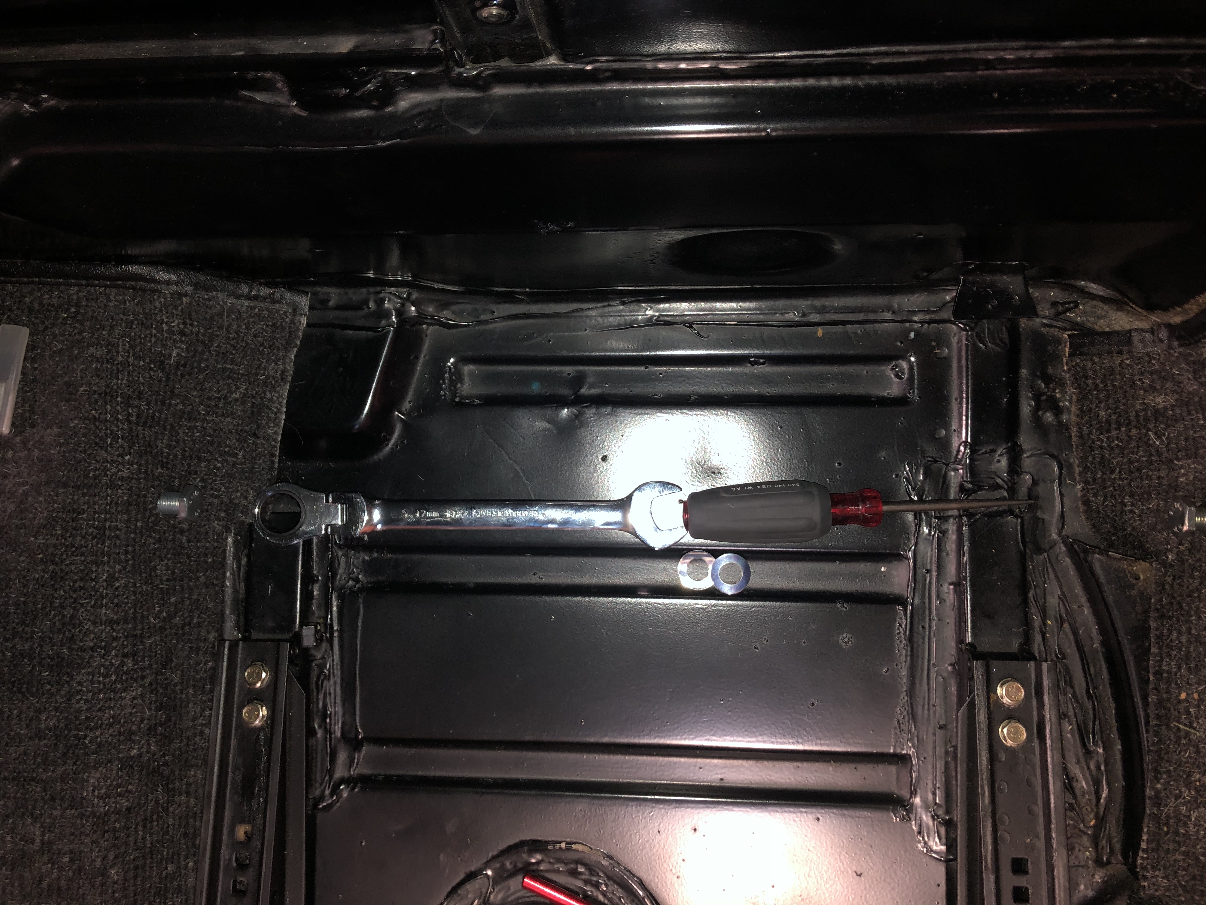 And OH YEAH, it needs freaking seat belts in it!! I ordered harnesses the Monday after getting the car and put them in yesterday, there were literally never belts in the car as I had to make the holes in the carpet to get the bolts in: |
