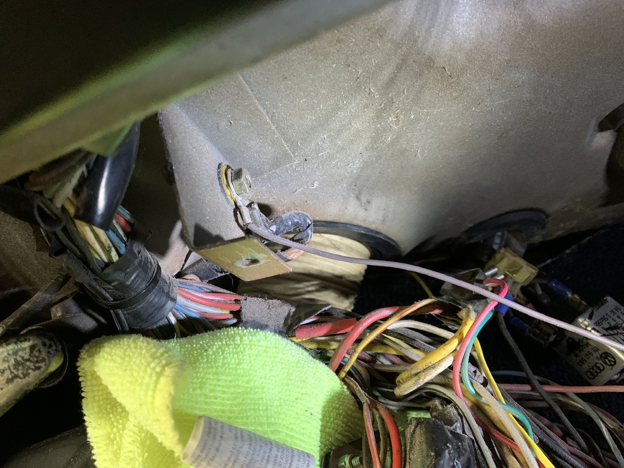 i took the white wire with blue stripe that comes from the fog light relay, which normally terminates(grounds thru the negative on the fuse box #1 fuse, and grounded it to this chassis ground point, thus making it work independently from the high/low light circuit. now it’s on with its own switch and does not turn off when high beams go on either.