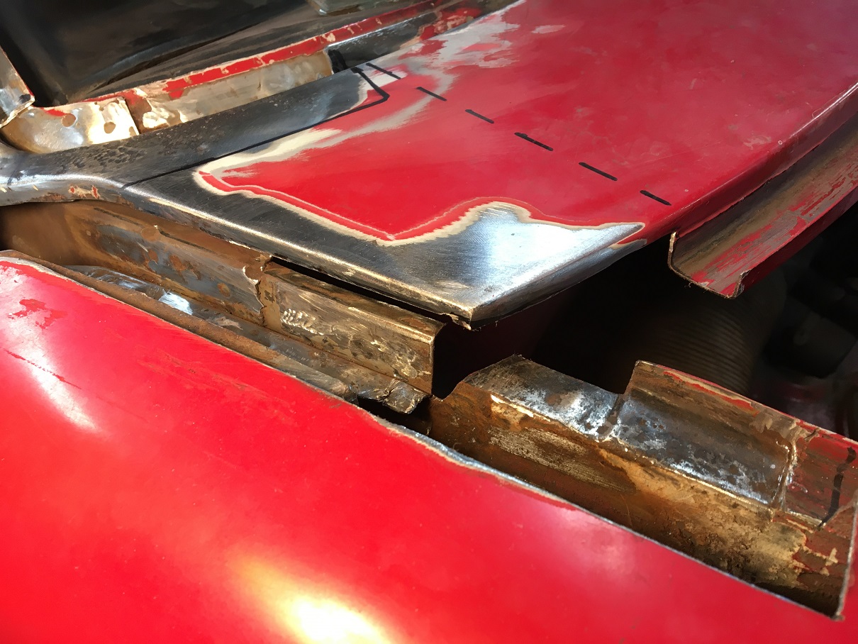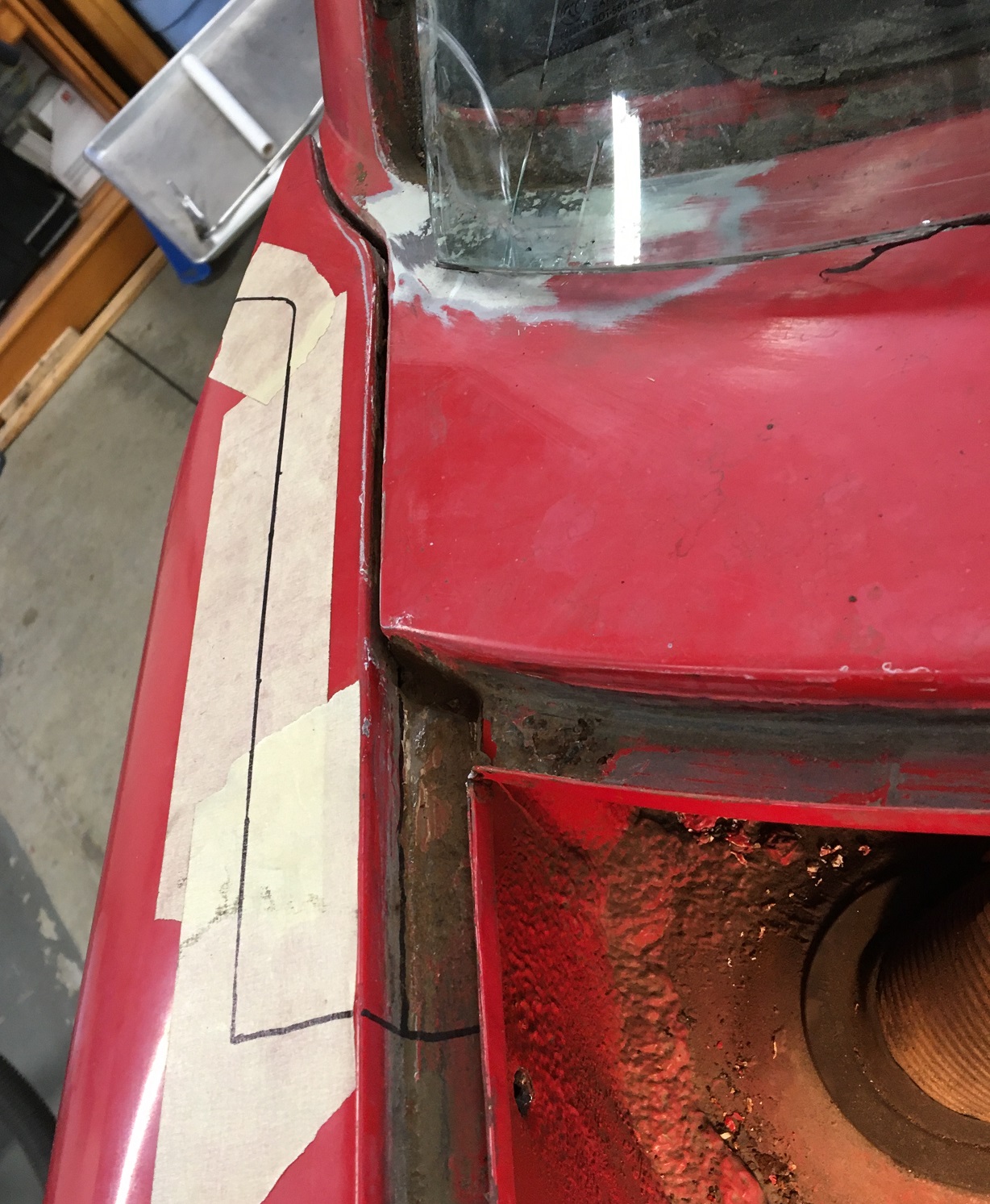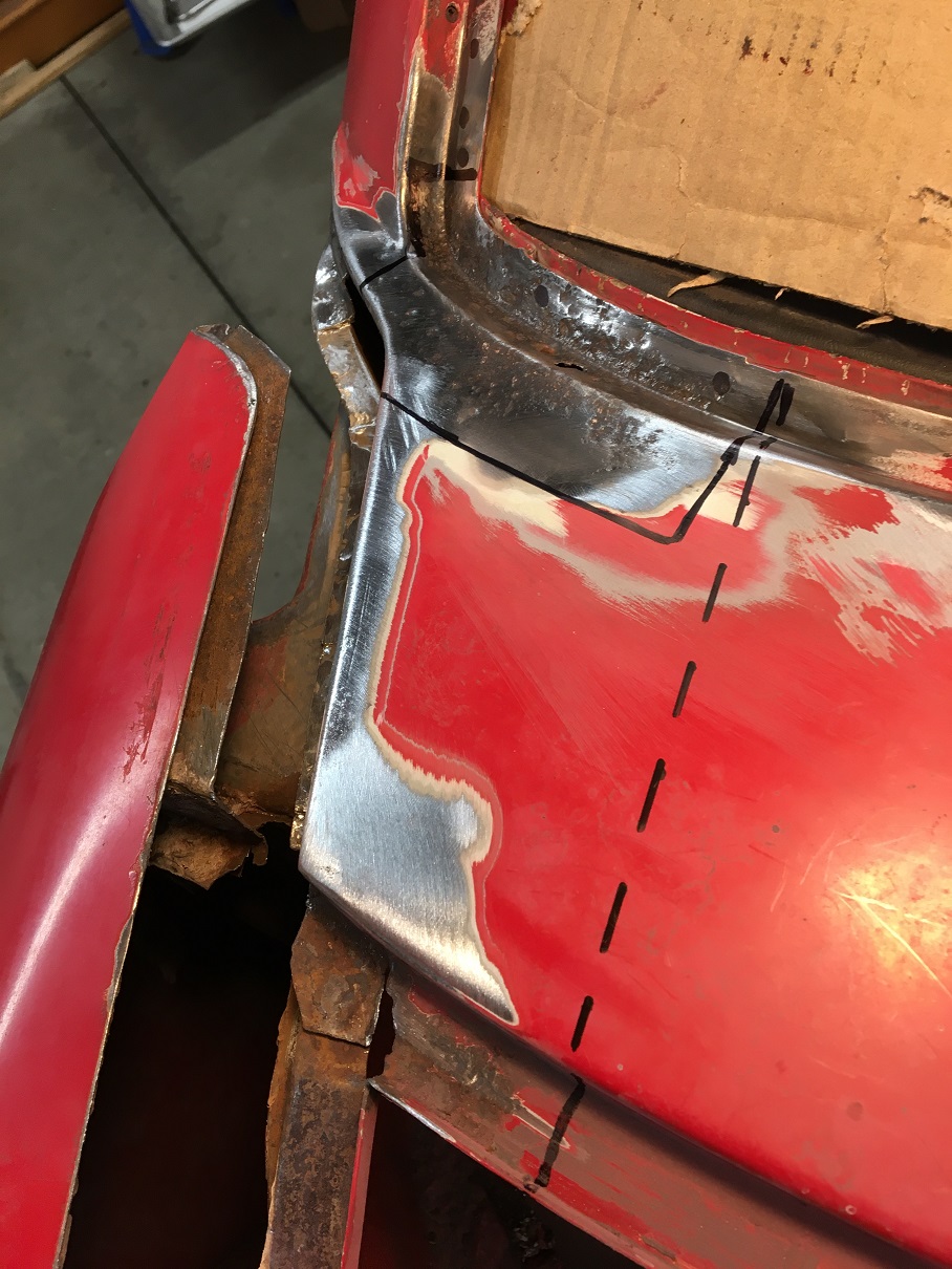 Did a little work this WE. I removed some metal in the windshield corner area while waiting for the repair sheet metal that should arrive Wednesday. I still haven't removed the pitted area, but I am leaning towards cutting the solid marker line, not the dashed one in hope to better keep the overall line of the cowl.
