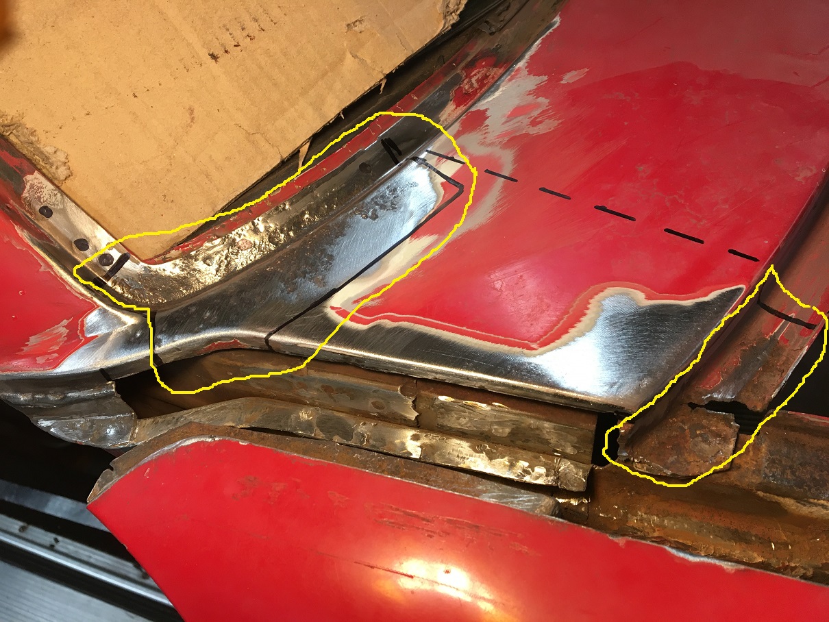 Original post; I got side tracked on my Microsquirt build as I have decided, after 11 years of ownership, to finally get my car painted to get her ready for her upcoming 50th birthday. (IMG:style_emoticons/default/smile.gif) Knowing these endeavors can take a lot more time than initially planned, I hope to make it in time... (IMG:style_emoticons/default/wacko.gif) Well that date has long past now... (IMG:style_emoticons/default/rolleyes.gif) Originally bahia red 73 1.7. The goal is a narrow body Front: 914-4 A arms with Rear: Drilled hubs, But before I get the pleasure of installing all of these beautiful fresh goodies, I need to tackle the not so fun stuff... (IMG:style_emoticons/default/headbang.gif) I have already started fixing some of the rust issues and will share that progress in the near future but right now, I wanted to post some of the issues i have on the passenger side front fender. (IMG:style_emoticons/default/sad.gif) I have searched and read many of the builds here but I would like some inputs from the people who have gone through this mess. I am trying to understand the construction of the rear part of the fender, more precisely the area joining the front cowling. Below is a sketch of how I think it is made but i would like someone to confirm... Having removed the seam sealer in the upper rear area, I have discovered "this" (IMG:style_emoticons/default/dry.gif) which is not really unusual, but clearly a pain to fix. I am not sure though what I am looking at. If my sketch is correct, I guess the inner rusted layer is from the fender rear bulkhead that actually becomes an inner layer on the rear upper point of the fender by the door and cowling junction. ![]() ![]() I might be able to cut this from the underside preventing me from cutting the outer surface of the fender. But I would like to better understand what is happening at the junction to the body. How many layers are there from the fender, one or two? Is the metal peeling off at the joint to the body the metal from the bulkhead/inner layer, or is it the outer fender layer? As a reference, this if the situation of the channel, surface rust, but how bad? Is there a way to better know without destroying? Maybe poke with a screwdriver? (IMG:style_emoticons/default/confused24.gif) ![]() Comments appreciated (IMG:style_emoticons/default/smile.gif) |