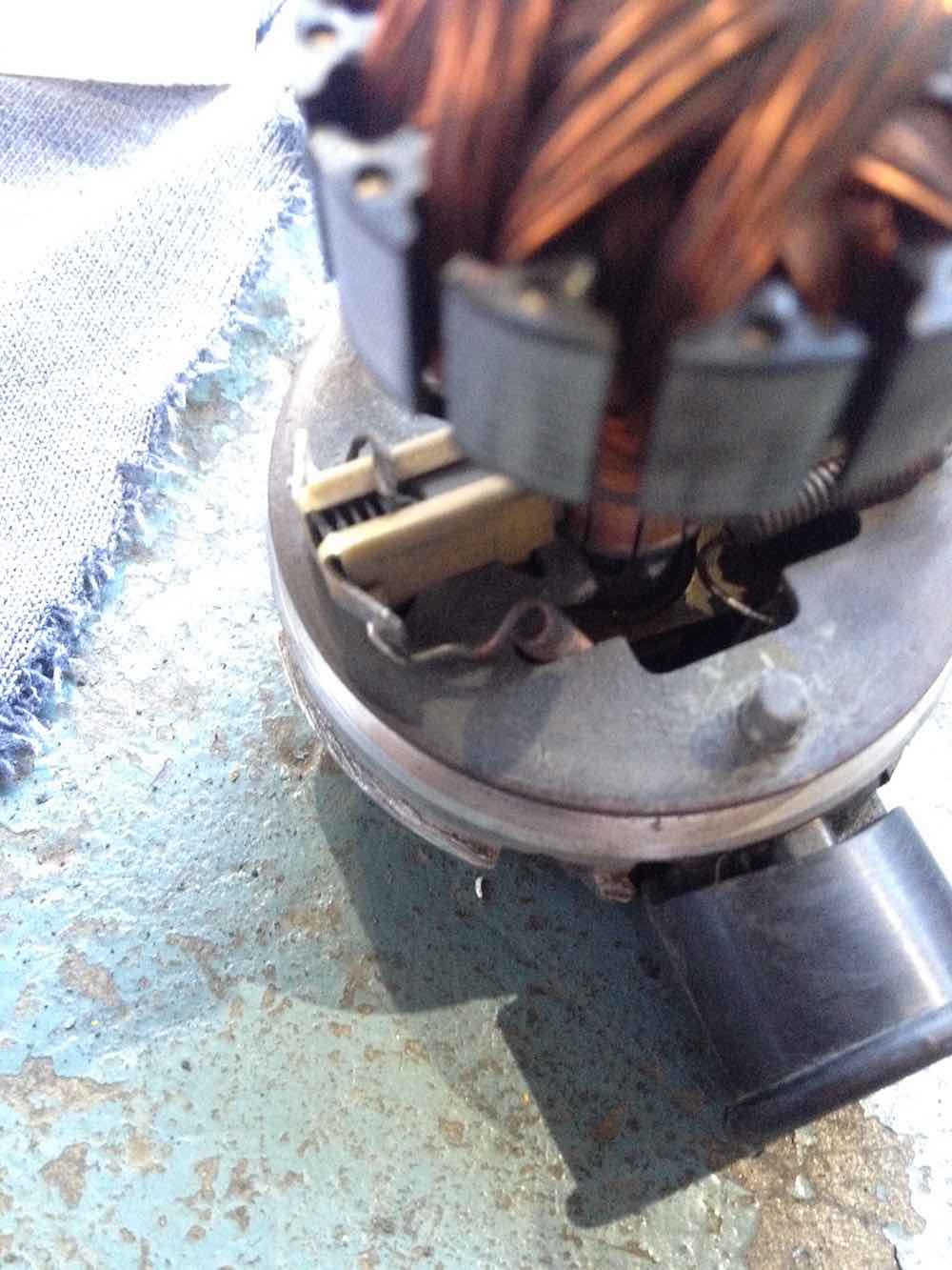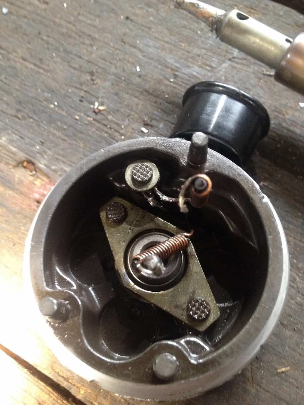 fitting the port housing inner plate & brush holder. i retained the starlock (or quicklock) washers when i disassembled. took them off carefully so good to reuse. if you damage the starlocks get some new ones. i flattened the starlock tongues using a very small socket to get them to preload again. i used a slightly larger socket to push them down on the securing pins. next i resoldered the spring wire connectors to the brush housings. carefully move the wires into position and push the hook ends through the slots/holes in the connection plate. i used my original disassembly photos for reference. fairly easy to see where the wires must go using logic. very difficult to make errors such as crossing the wires up accidently. both stay on the sides of the electrical plug they come out of underneath the brush plate. i did have to melt existing solder out of the holes before i could clip the wires in. once clipped solder these connections. soldering went much better than the earlier frustrations i had with the earth wire in plug base. i repeated the same with the 005 pump i am reassembling. had to do a bit more work on that one. different style of brushes and electrical connections on the earlier 005 pump. one of the brush connections needed some more securing solder repair. after soldering clean up any loose solder drips, blow out with air and electrical cleaner, you don't want anything trapped inside this assembly that could later break loose. |