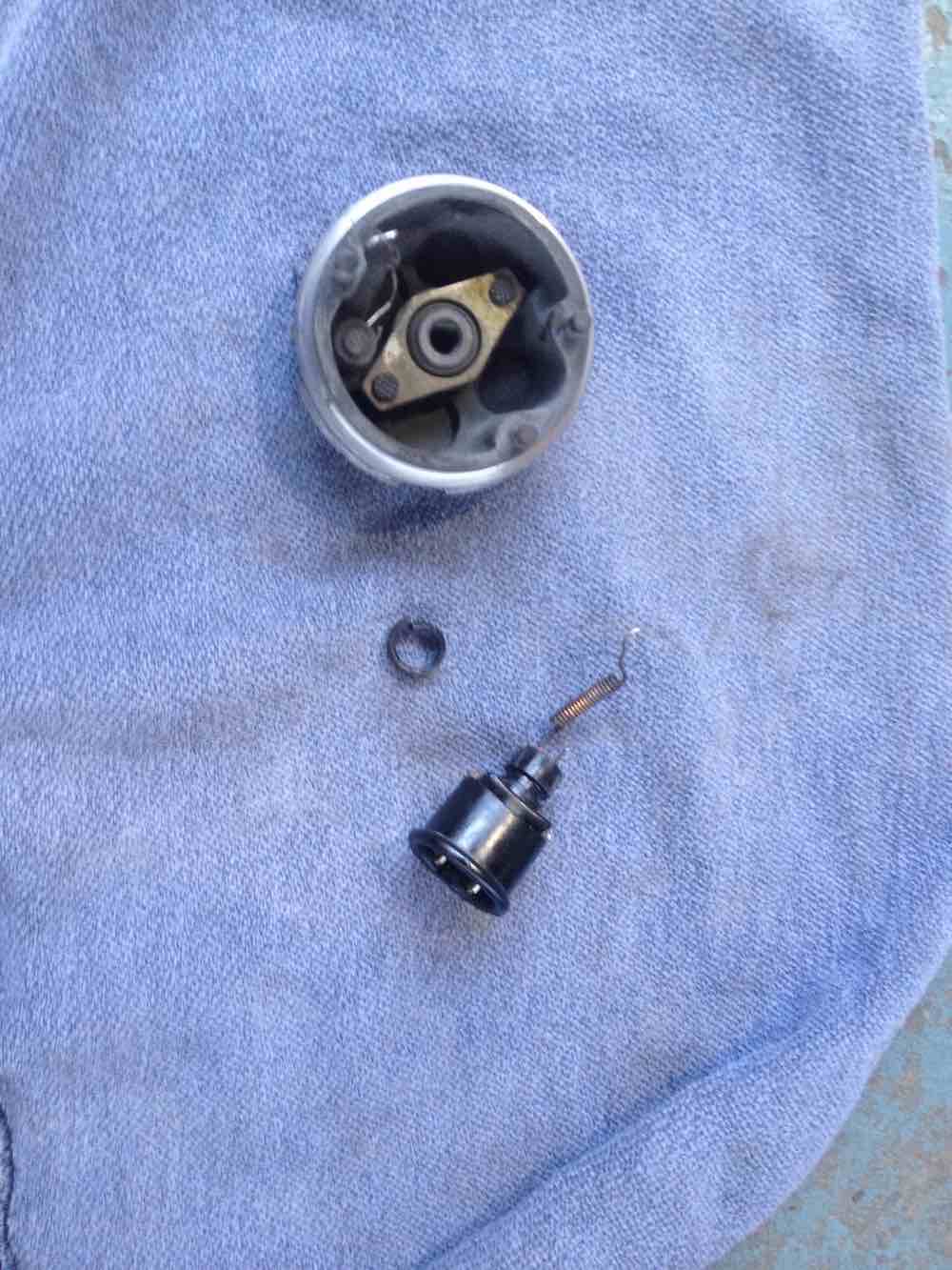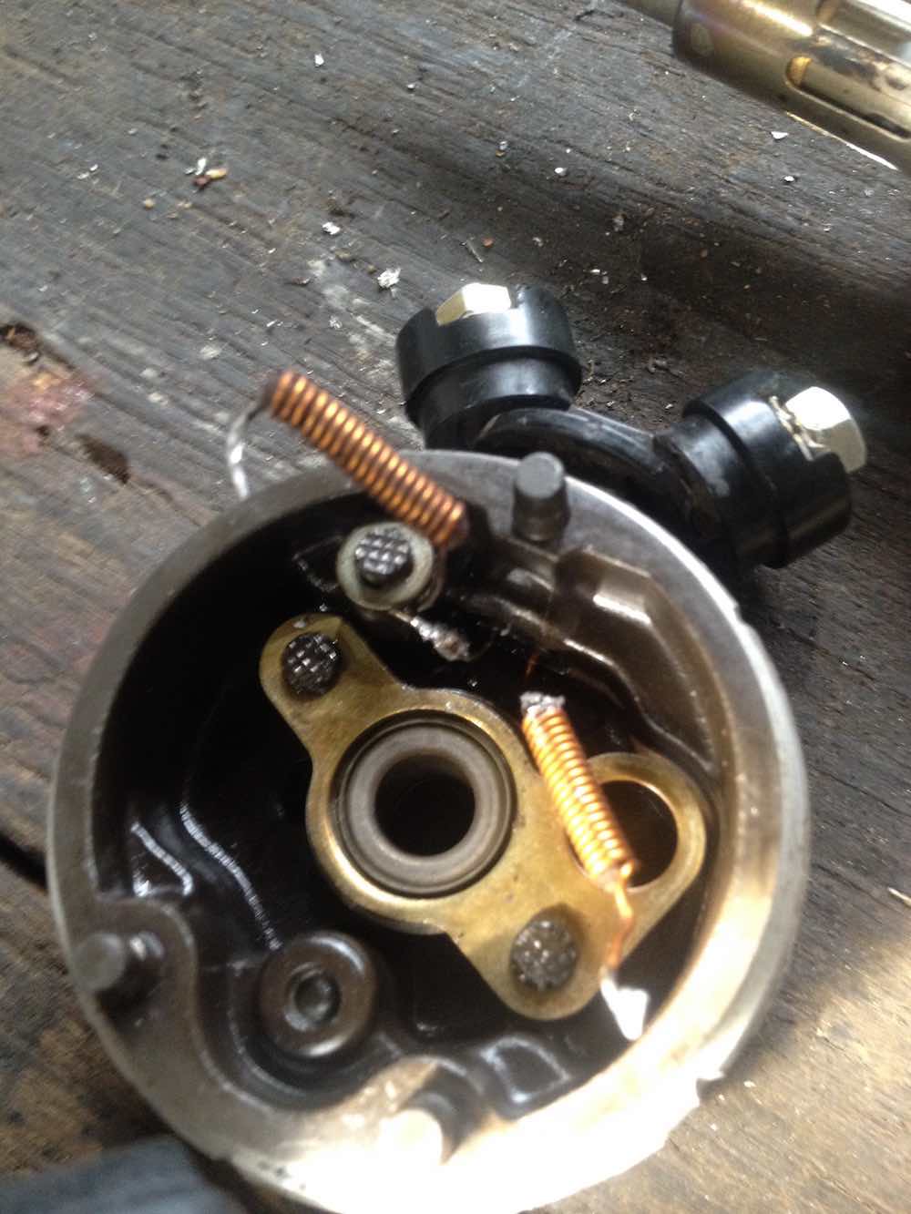 step 2 gets you to one of the internal leak failures. the big o-ring sealing the motor housing. i inspected this o-ring. it was hard on one side and had definitely been leaking. but there is one more seal to go. the electrical plug. Additionally at this point you can inspect the commutator and brushes on the electric motor. Mine were in good condition with reasonable level of wear. made sense. the car is a two owner car with 44 K miles and its been dormant for the last 16 years. the pump is worth saving assuming i can solve the leaks with new seals. Moving on. Electrical plug removal. at this point you have to get the lower part of the port/pump housing apart and detach the motor. first. there are two electrical connections rising from the plug to the brush holders. these wires are like springs at the brush ends. take a soldering iron and release the solder joints so they are free. next there are three spring washers which hold the pump/port housing together. work these off with a fine pick and a small fine screwdriver. finally drive out a very small pin which secures the motor axle to the top of the pump housing. you will need an ultra small pin punch, less than 2mm. or 1/16 in imperial size. be careful driving the pin out. i secured the axle in a vice with soft jaws and placed a rag below the vice to catch the pin. you do not want to lose this pin, its very very small. pull the motor out of the pump/port housing. carefully lift the internal face of the pump/port housing up threading the spring wires through it as you go. once apart stop there. you will be looking at the back of the electrical plug and if its a 009 pump it should look like the last image. there will be an earth wire, going to a stamped pin and the same stamped pin holds the sprung wire that connects to the brush holder on the motor section you have detached. to note. a 005 may not look like this. at some point i will know as i have a 005 to disassemble, but i have not done that yet. |