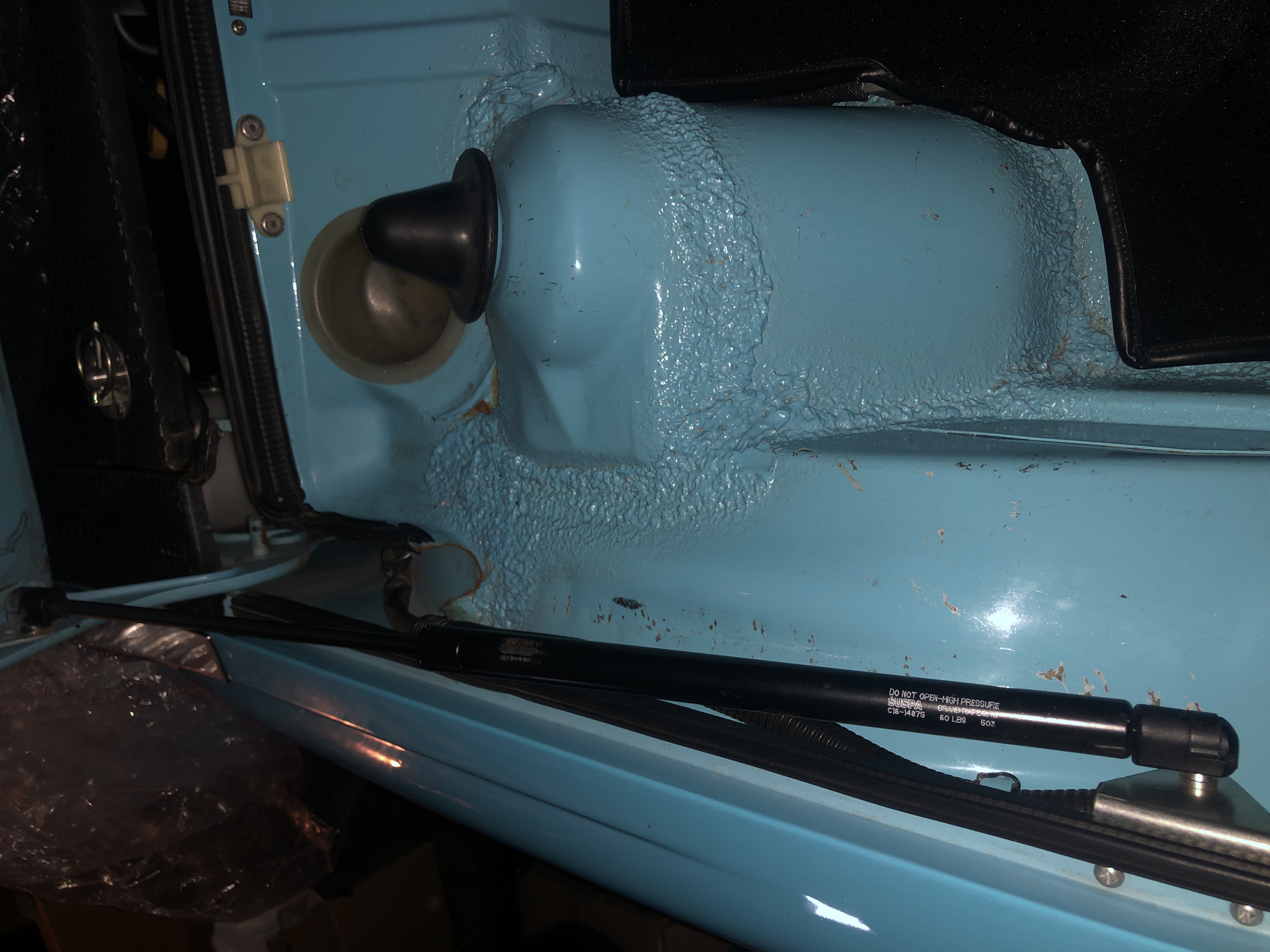 I don't like them. He cut the pinch weld between the trunk and the engine compartment, he drilled holes in the trunk hinges and the lip. I think they are a butcher job and get in the way of the storing of the top. And the ones on our six now have the lid hitting me on the head, so I have to carry a prop stick anyway. I am going to remove them and install replacement torsion bars. |