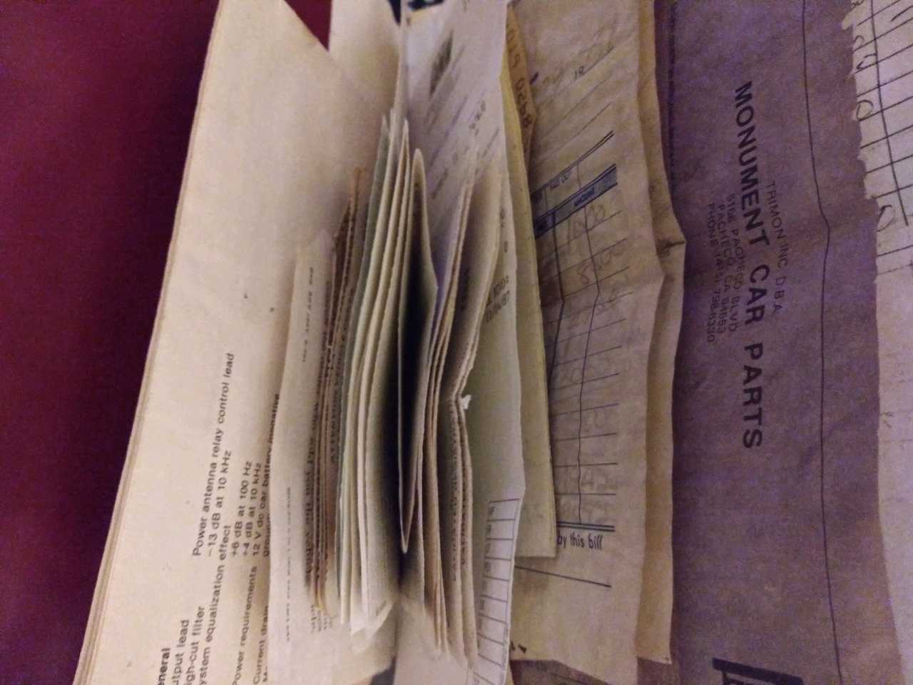 From what I gather through my quick skim of documents which accompany this car, this 1971 was first leased in CA back in 1971. It was leased by a member of the US Coast Guard. The 2nd owner seems to have been a member of the CG too. I am not certain about owner #3, who owned this from 1983 through 1998. In 1989 he purchased the fuel injected 2.0 that is now in the car replacing the 1.7 it came with. I believe the car came from CA to Missouri in about 1996 and was later acquired by owner #4 in 1998. The plates on the car expired in 1999 and the car has been parked since. I have the original temp ID when issued from new as well as several years of CA inspection and smog docs along with several receipts for items purchased through its life. Odometer has clicked over, believing this to have 101,809 miles. July 1992 CA smog has mileage at 55,155. This car has very little rust and what is there is only surface, nothing cancerous except inside the rear trunk. There are a couple of dime sized holes above the muffler's heat shield. And I absolutely love that it has a quad tipped Monza exhaust. Not that the exhaust is great, but its in great shape... Chrome tips aren't rusted, has the factory tape in tact and in good shape. I like that its going to be coming off and added to my collection 'O parts for nostalgic sake. Now for the pics.... |