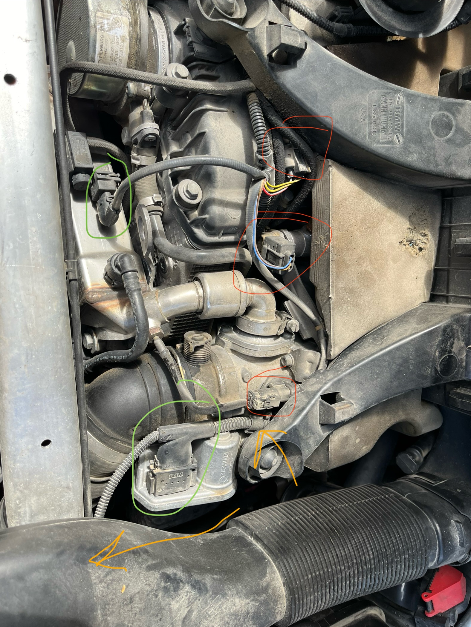 Note the varying use - standard connections on non-emissions, non safety components. There is a boot used on the EGR cooler. An emissions related component. The throttle stepper motor also has a boot because the throttle motor is a safety component. When a boot like this is used, the wiring must be secured nearby to ensure the boot isn’t supporting the wiring which will tend to cause intermittent connectivity issues and/or pin pullout. The wiring for the throttle motor is secured at the locations of the orange arrows to help mitigate those risks. |
