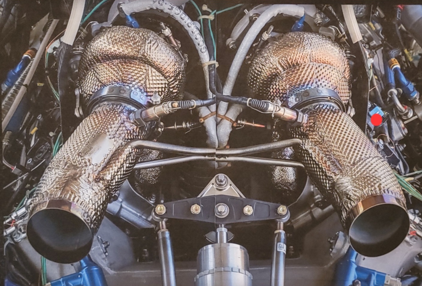 Pic showing the twin turbos mounted inboards in the V of the engine; indicating that they've swapped directions of intake/ exhaust paths (again 918'ish) making the packaging tighter.