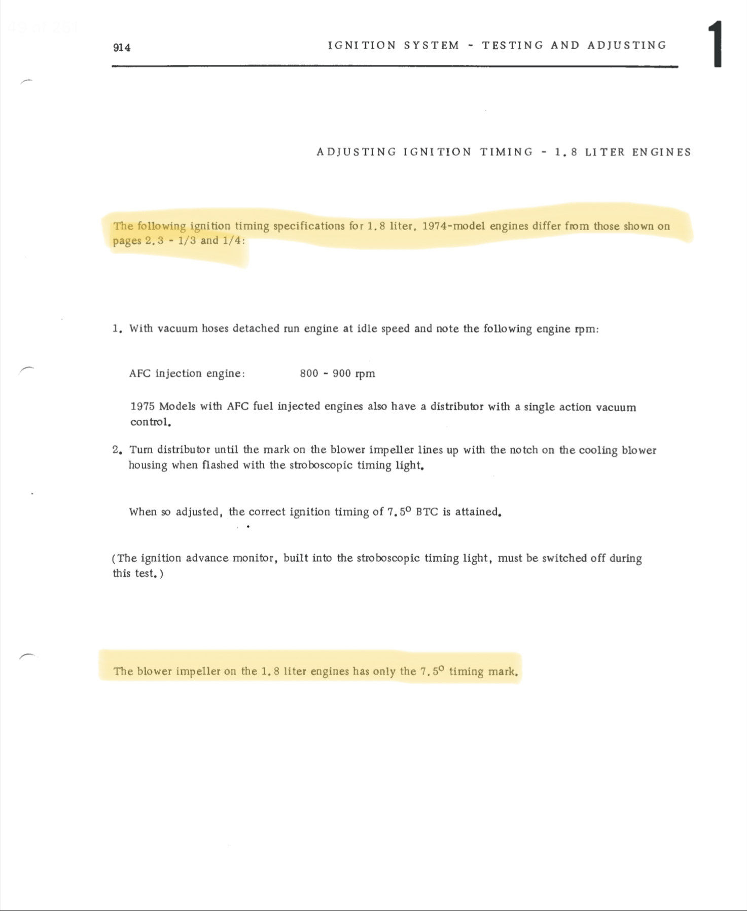 (interesting note i had never bothered to read before about new/replacement fans only being supplied with TDC mark - and is from manual dated XI 1974 (nov 1974) well after the 1.8s were introduced.) esoteric point but looks like the way factory did it was to mark up a universal fan part two different ways depending on which car it was going in after 1974 MY. if a dealer had to install a new replacement looks like they had to notch it up themselves before installing (IMG:style_emoticons/default/biggrin.gif) (IMG:style_emoticons/default/biggrin.gif) more useless historical information. anyway. Van & mr perrine are right. ignore all other marks other than TDC and 7.5 ![]() |