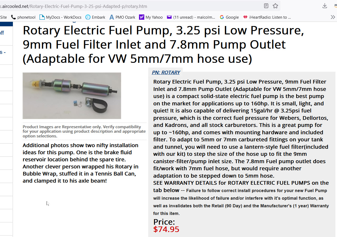 https://www.cbperformance.com/product-p/0103.htm Also, the repackaged Carter pump retailers sell (CB, PP, AC.net, and others) is available on Amazon for about half the cost. Not sure why there's such a big markup on these from the average car sites. Carter part number P90091. https://www.amazon.com/gp/product/B07BBDSZP...=UTF8&psc=1 |