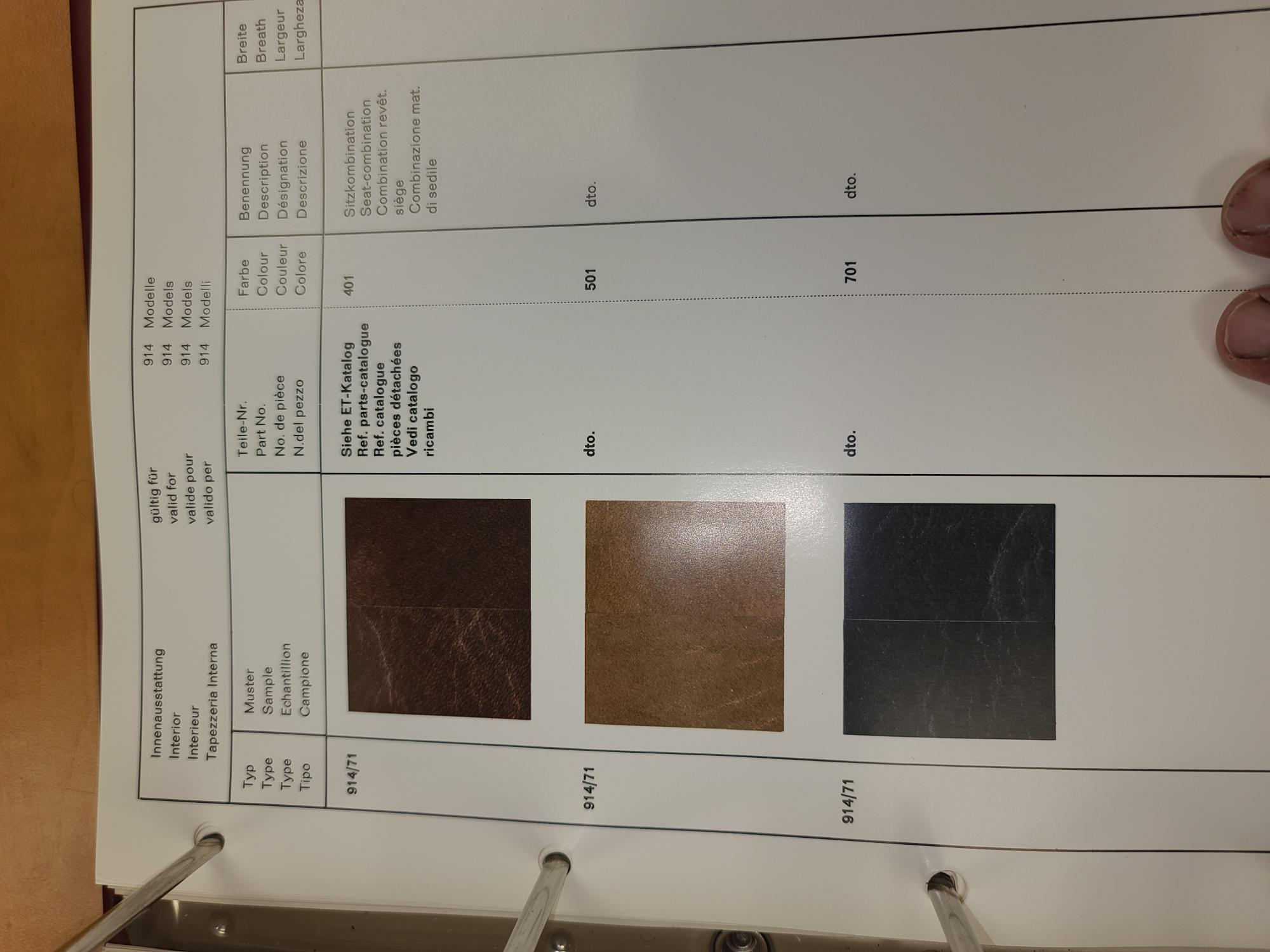 Useful material for owners of '71 914s 1971s had a 'one year only' interior that had a similar grain. Looks like the thicker material used in 70. The 71 used “shiny leather” a thinner, smother looking material with a more reflective shine. We matched it off of the 71 - 701 sample Attached thumbnail(s) |