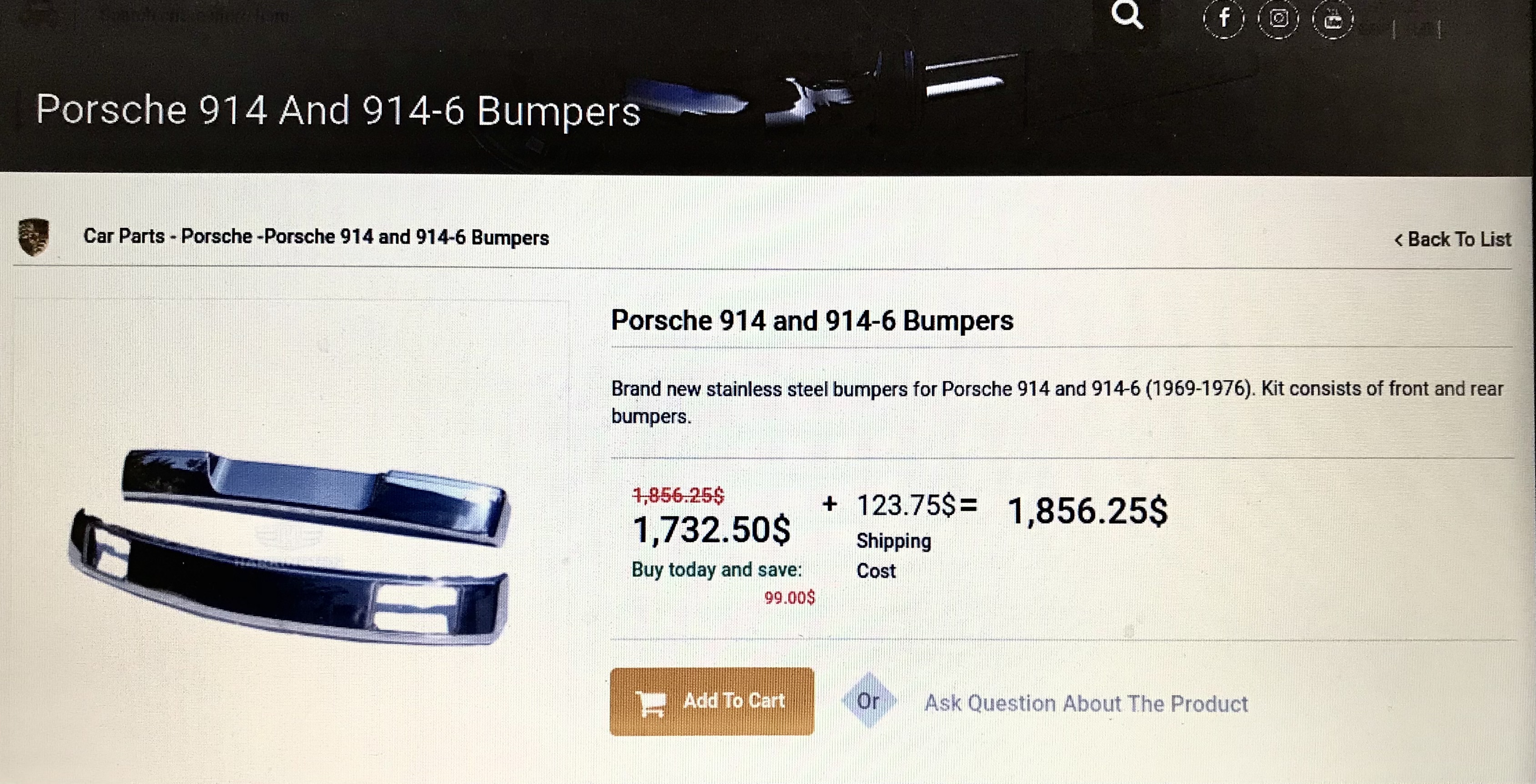 They are a company based out of the U.K. that has a factory in Vietnam which is where the bumpers are manufactured. There are vendors in the U.S. that buy from Harrington and resell. I just checked Harrington's Website and the price for a set of stainless bumpers for a 914 is 1732.50 plus 123.75 for shipping. I bought my bumpers direct from them a few years ago and they shipped via DHL right to my door... There are multiple threads about these bumpers. |