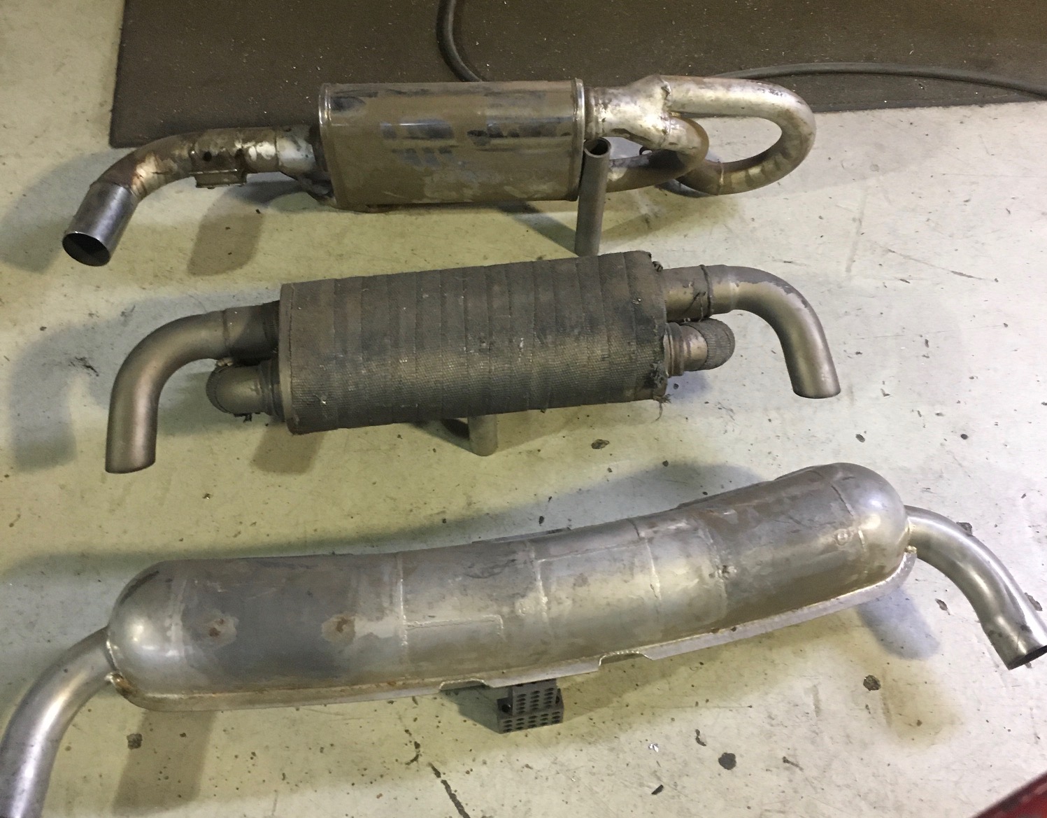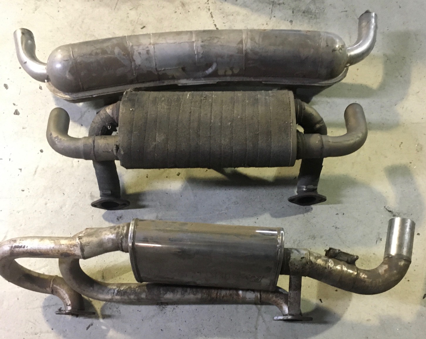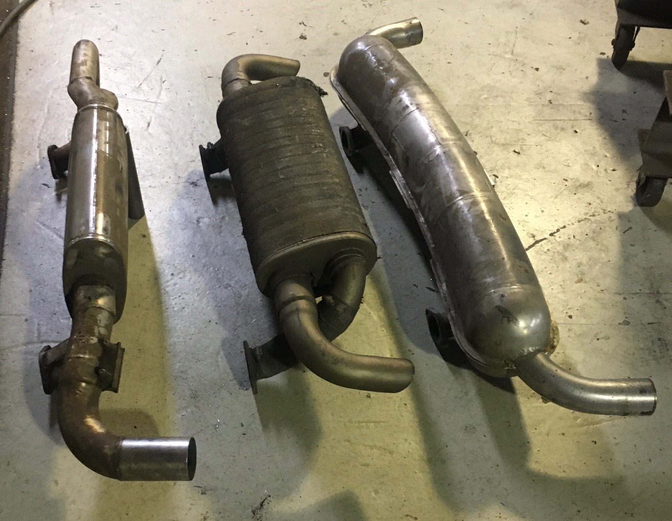 I'd be curious to know how loud that Super Turbo muffler is... it is pretty small. Had you heard it when it was on the motormeister motor car? Here are some pics of the 3 mufflers I have available. The Dansk has a bunch of welds on the outside so someone already modified the insides. I don't recall where I got it or what was done to it. The next one was behind a 2.7L with 1 3/4" headers. More than 20 years ago I installed the single outlet muffler with a set of B&B HE's on a 2.7L built by Motormeister. (IMG:style_emoticons/default/barf.gif) Eventually the customer ended up with a 3.6L and left the muffler here after buying one of my mufflers to fit behind his WEVO 915. |