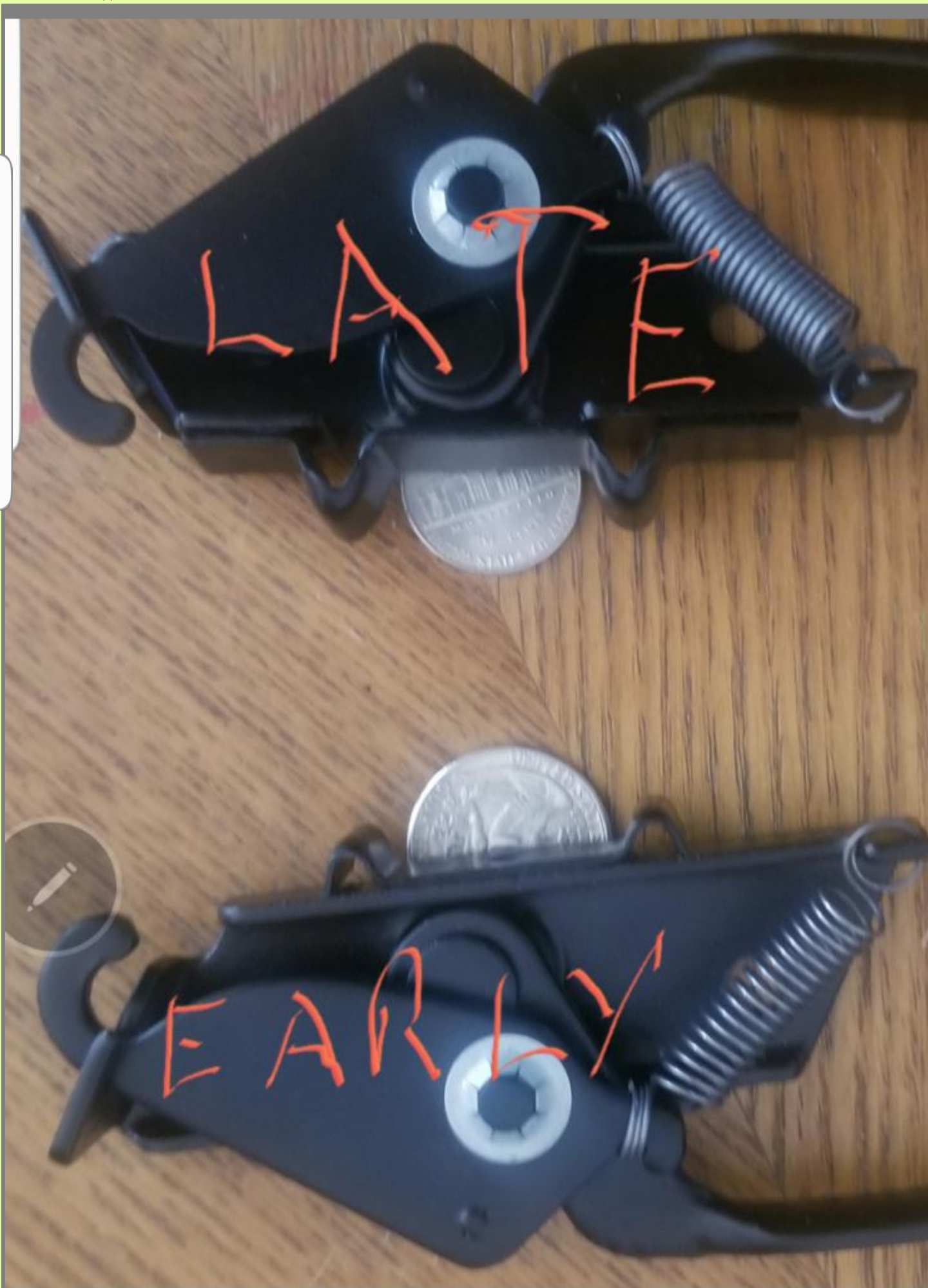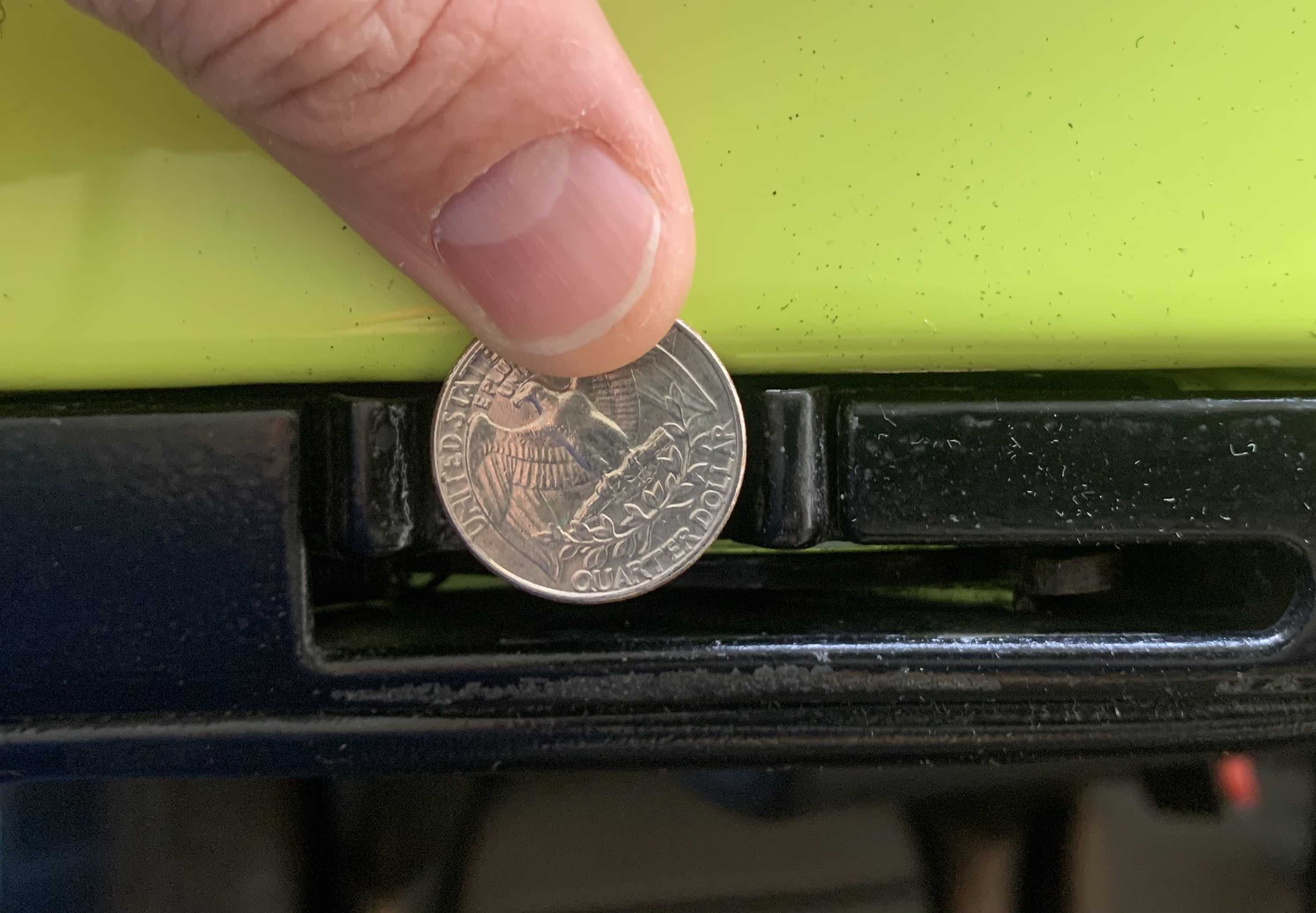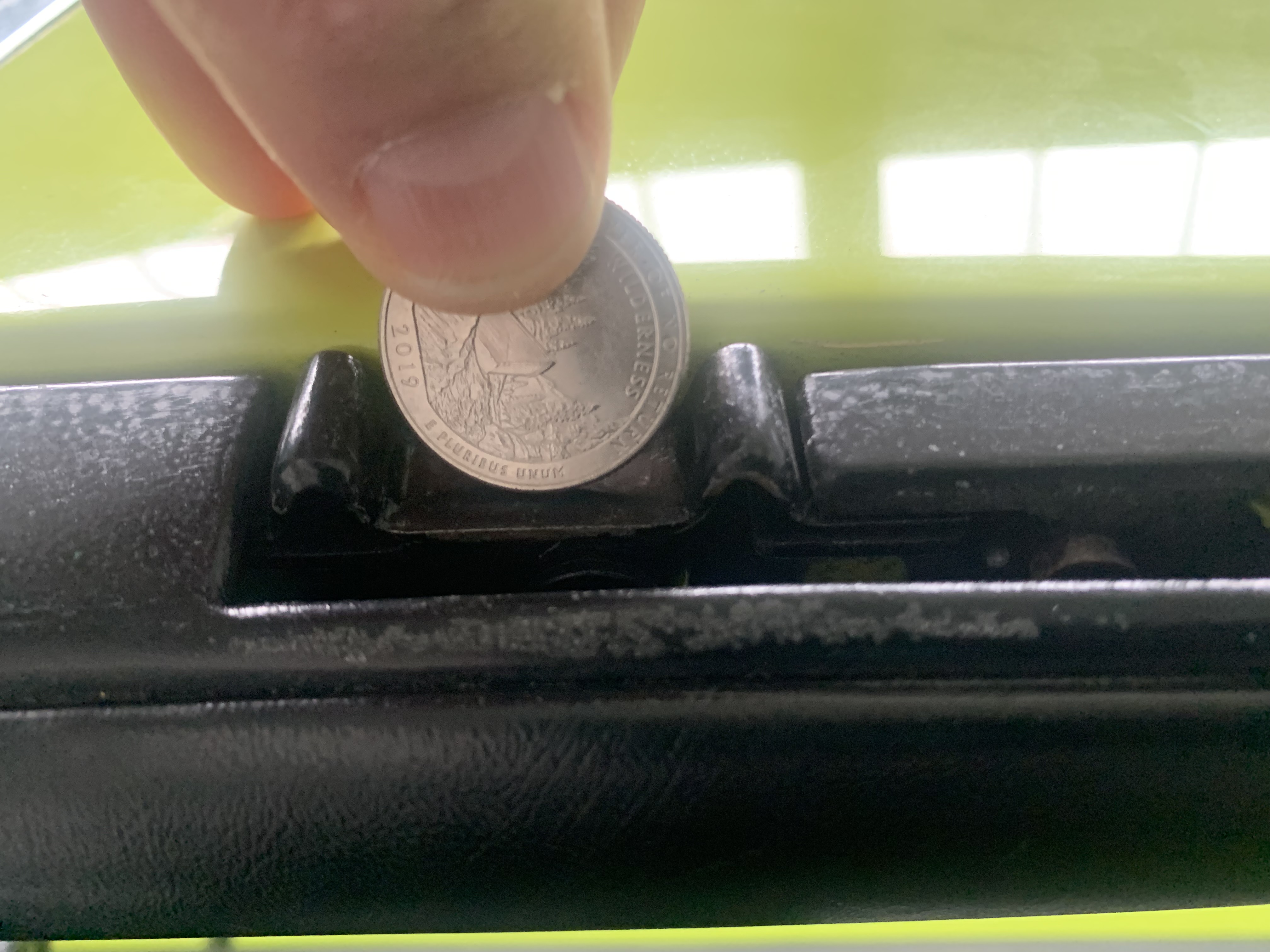 It is hard to tell from the way you hold the quarter. If the latch is late the quarter should fill the gap between the bumps. Late a quarter or nickle flat on the rubber block to see if it is early or lare. It is common for wrong tops to get swapped. If the top and latches are mismatched I would match the replacement latch to the top. How do the seals on the top mate to the top of the window? |