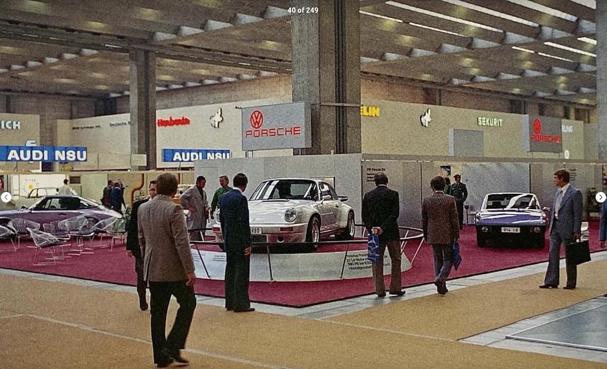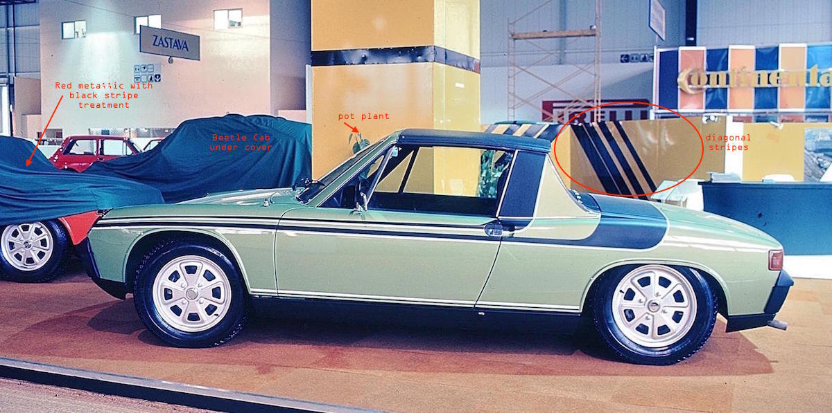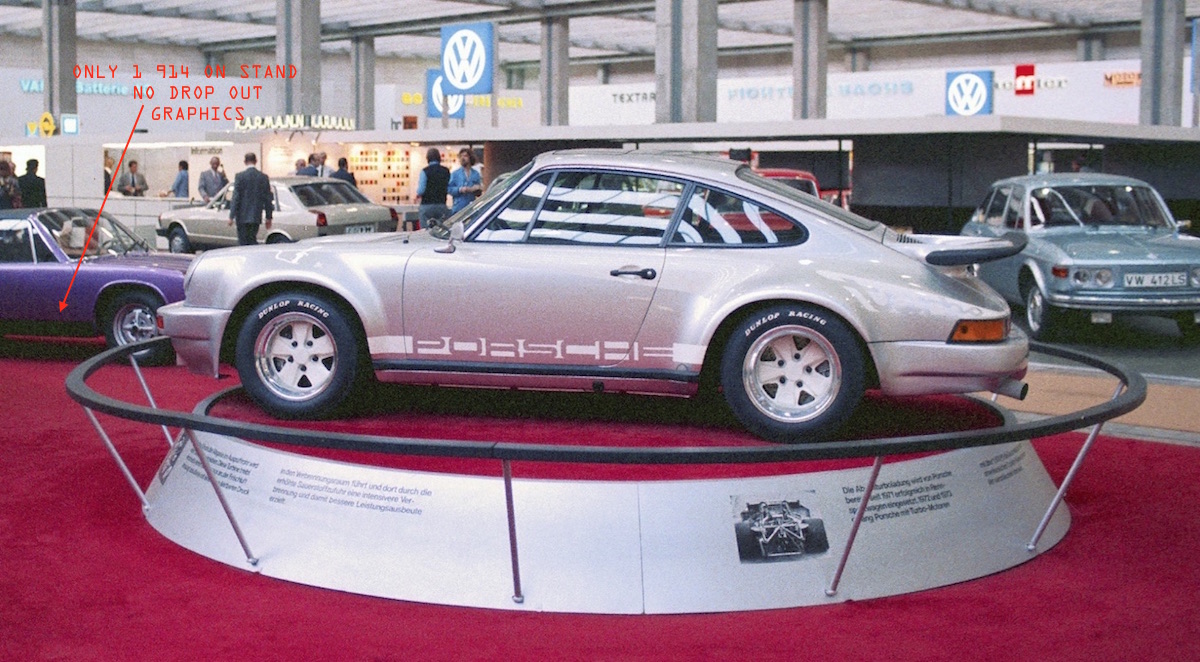 this photo is definitely frankfurt motor show. dates for Frankfurt are Sept 1973. this is where the 911 turbo is first shown. you can tell its frankfurt from architectural detail of columns in display hall and details of karmann stand in background as well as VW signs. the turbo is shown in proximity to all those 914 graphic cars on karmann stand. ---- next month its shown at paris. in october. the image of that is shown in ludwigson's book. different photp entirely. it would appear karmann cull down their display at the same time in paris to three cars i can find images of. but there was enough time to have produced a drop out graphic side stripe 914 which does not appear to have been present at frankfurt. i'll keep image searching - its possible trawling enough images that the karmann stand might appear in the distant background of other paris motor show photos of 1973. but have not turned up anything yet. |