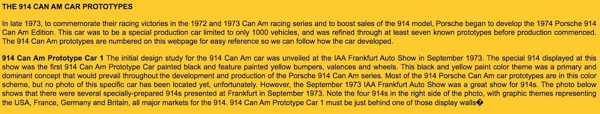 Wow. What excellent info you have researched and the sidebar context is tremendous. Your research matches mine, and with greater detail. The Can Am cars were built from mid-February thru the 1st week of April. Promotion by US dealers began in April/May. One of the earliest cars is the Matsuda Japan SL that George Hussey owns, built first day of production, and it has the negative stripes. I think you are on to something with that L&M car color scheme and the Creamsicle, LIKE the reference. That CS color scheme is also on the 73 911RS cars. But not the black/yellow combo, I have not found a literal reference for that scheme. Good on you... yeah - agree re bumblebees - not literal like the creamsicle. but what if the bumblebee was originally going to be dark blue and yellow. when they were still thinking of explicitely doing a "Can Am" edition before the last minute pull out of the race series in jan 74. and then as a last minute adjustment just like using the drop out graphics from the frankfurt show 911s they went to black as an opposite to white. i'm thinking if only those can am proto car photos you got hold of on your website were color rather than black and white. the ones with the can am lettering on the side. its a dark car for sure with light contrasting bumpers etc. but it could be a color that is not black. we are kind of conditioned to think it must be black. of course you need the photos. i bet the originals on file with VW or Porsche archive are color. they would have to be given they were assessing and designing the color scheme. once they detached from them having to be actual CAN AM series celebration cars they were free to move on to another idea about them being 100,000 anniversary special editions. the red and the yellow might be remaining elements of the earlier original proposal. again, just a crazy theory, nothing else. |